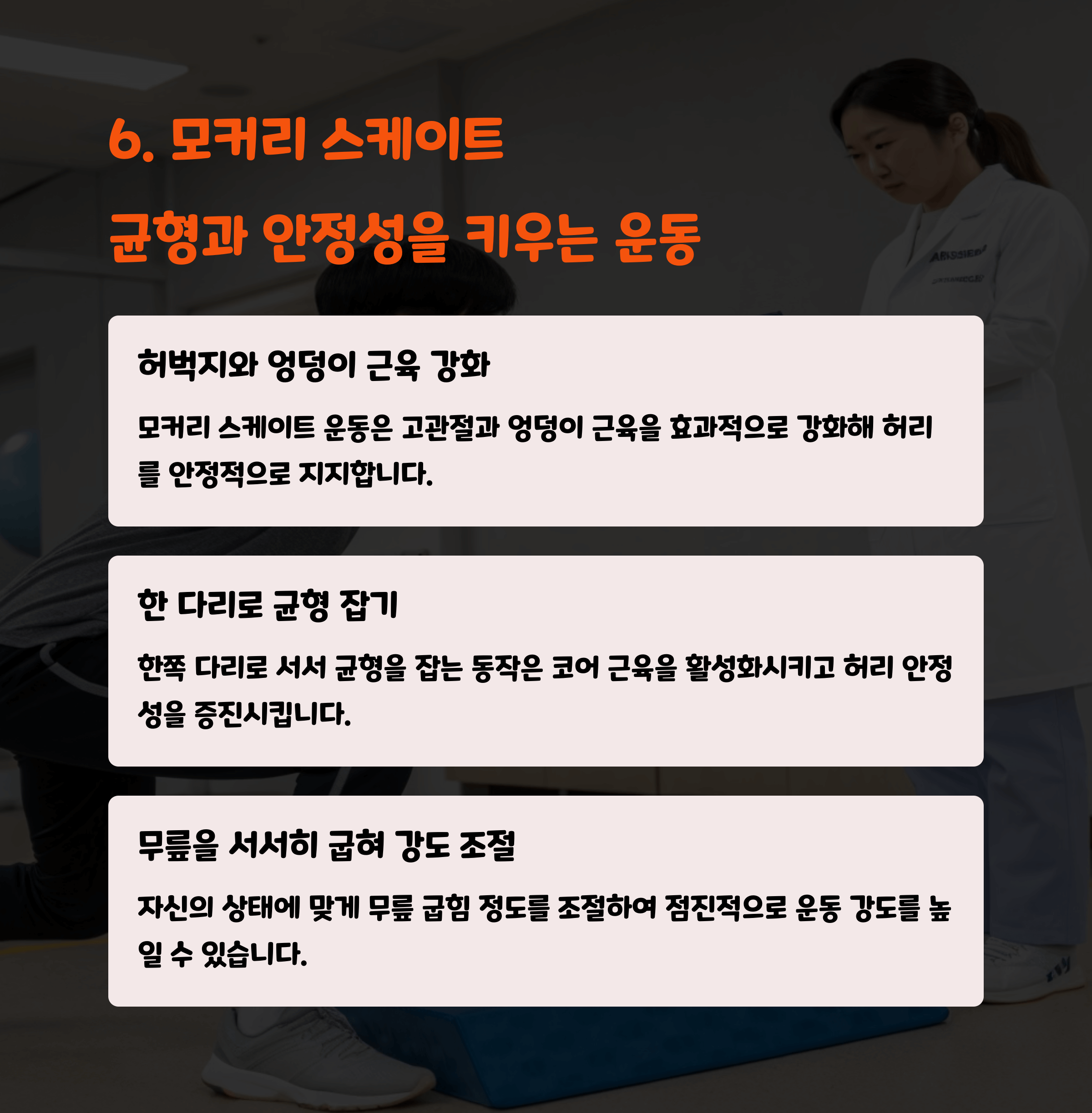 | 걷기 | 허리 근육 강화, 유연성 향상 | 빠르게 걷기나 달리기는 피해야 함 |