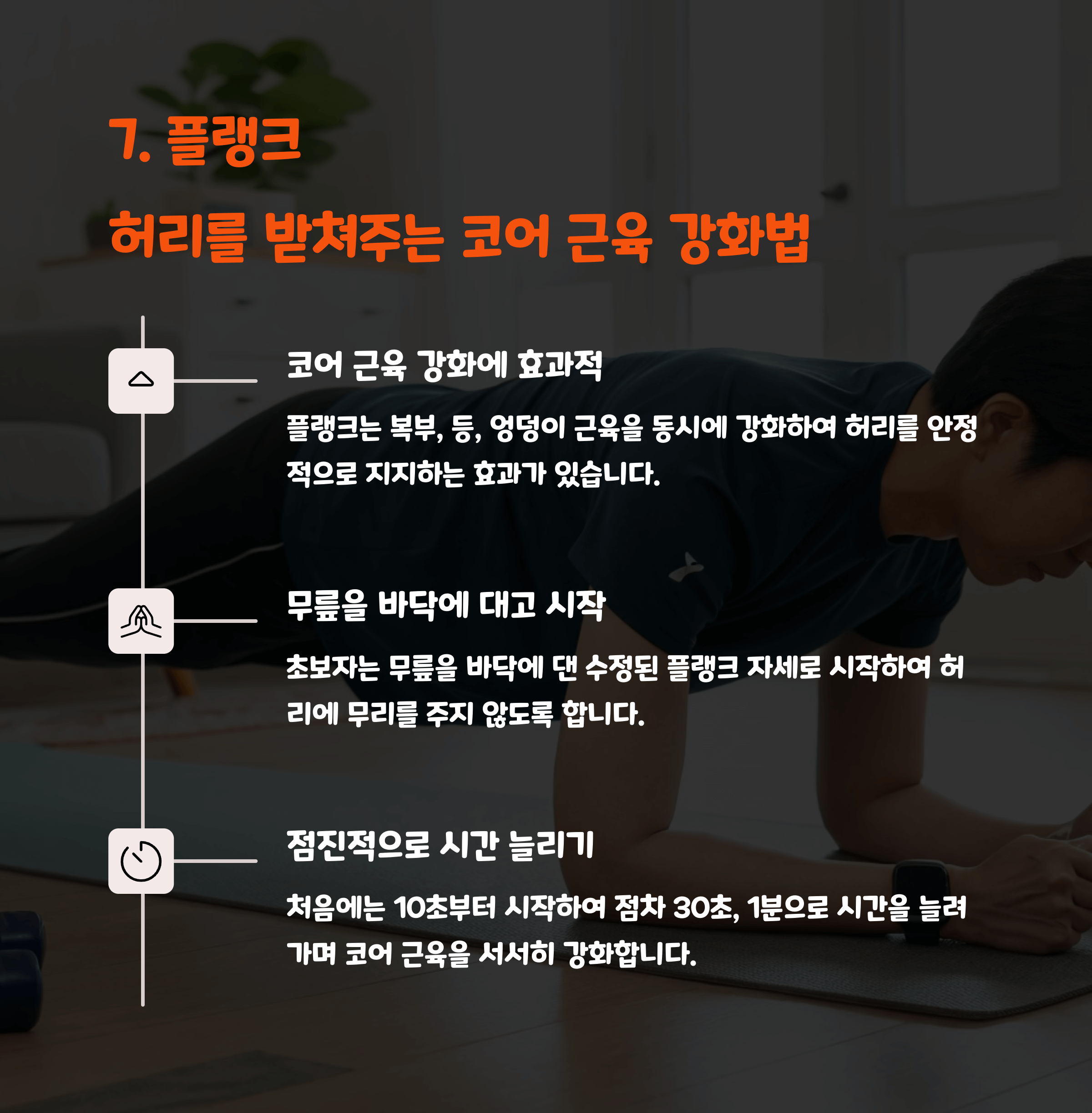 플랭크는 코어 근육을 강화하는 데 효과적인 운동이지만, 허리디스크 환자는 무리한 동작을 피하고, 무릎을 바닥에 대는 변형 플랭크를 추천합니다.