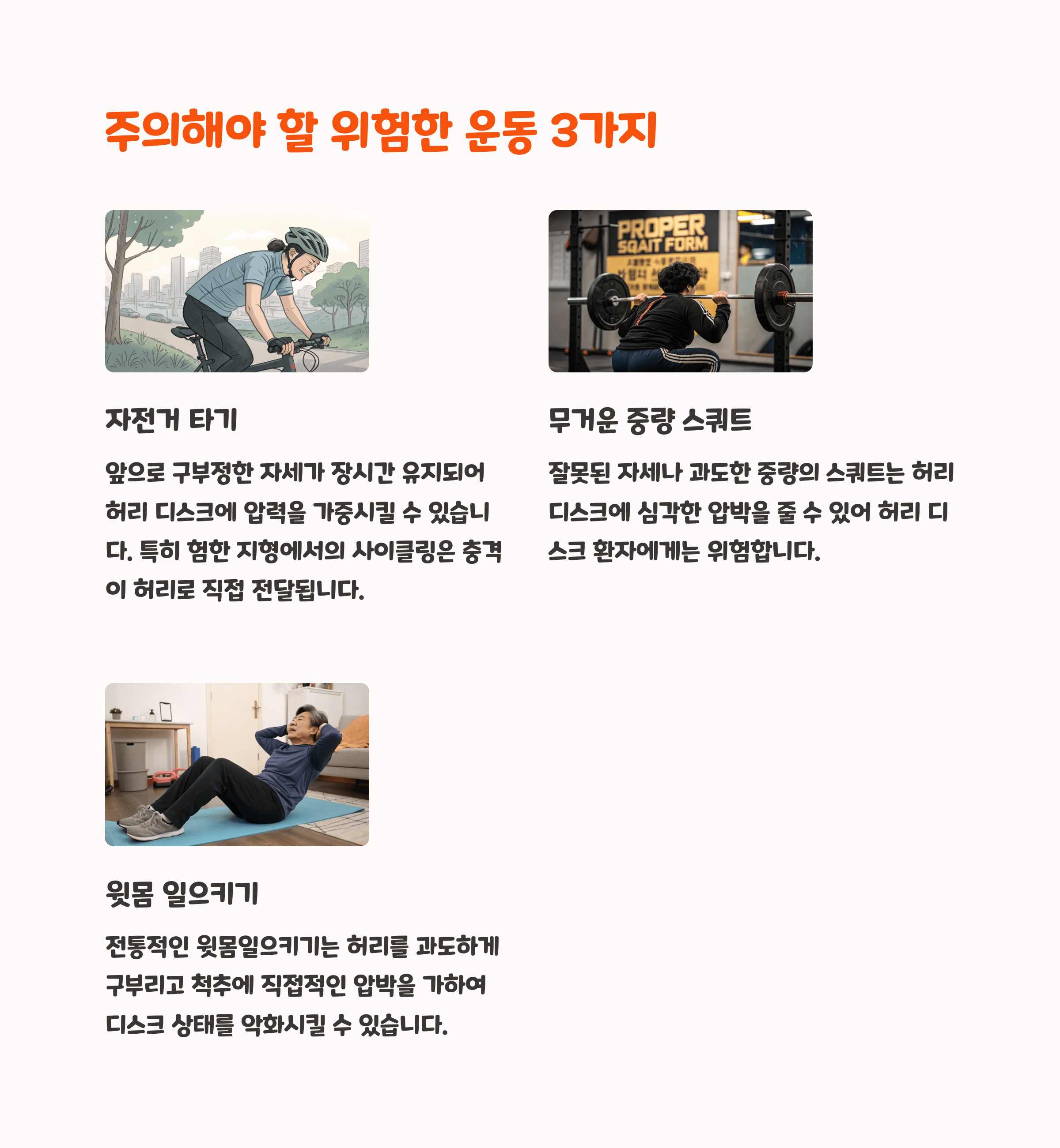 반면, 자전거 타기, 스쿼트, 윗몸일으키기는 허리디스크 환자에게 추천되지 않는 운동입니다. 자전거 타기는 허리에 과도한 압박을 줄 수 있으며, 스쿼트와 윗몸일으키기는 허리 근육에 무리를 줄 수 있습니다. 따라서 이러한 운동을 피하고 허리에 부담을 주지 않는 운동을 선택하는 것이 중요합니다.
