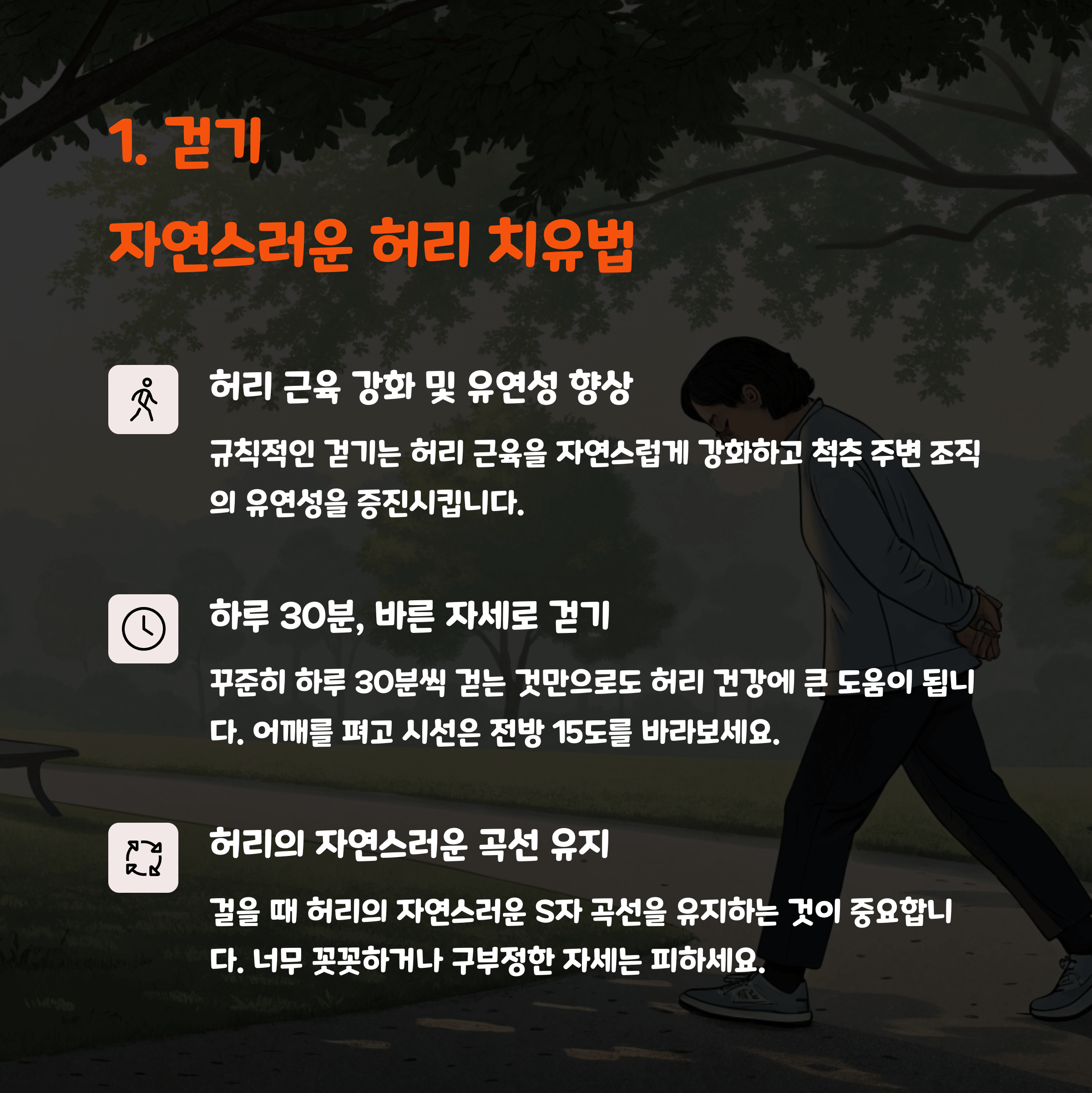 | 걷기 | 허리 근육 강화, 유연성 향상 | 빠르게 걷기나 달리기는 피해야 함 |