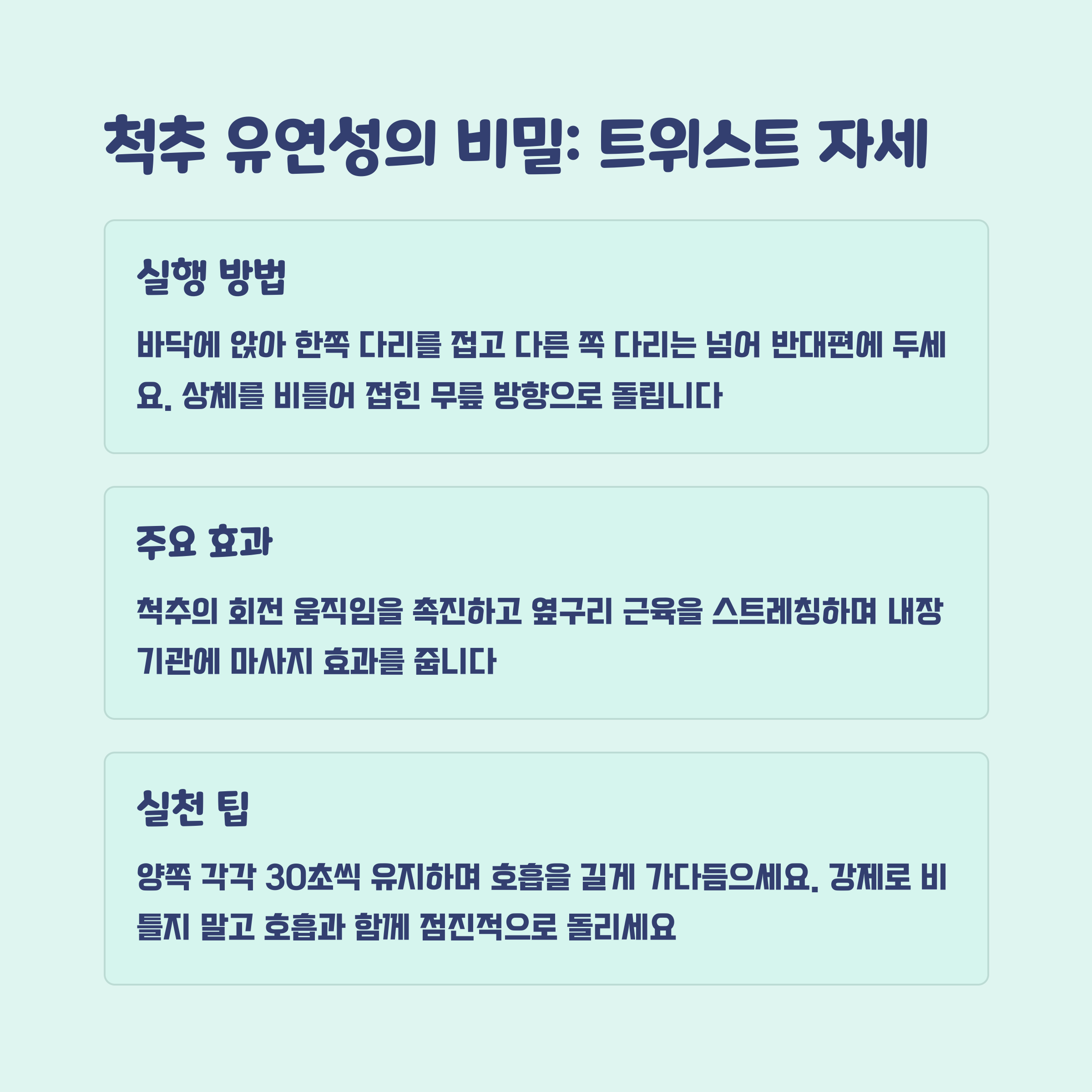 - 숨을 내쉬며 무릎을 한쪽으로 넘기고, 상체는 반대 방향으로 돌립니다.
