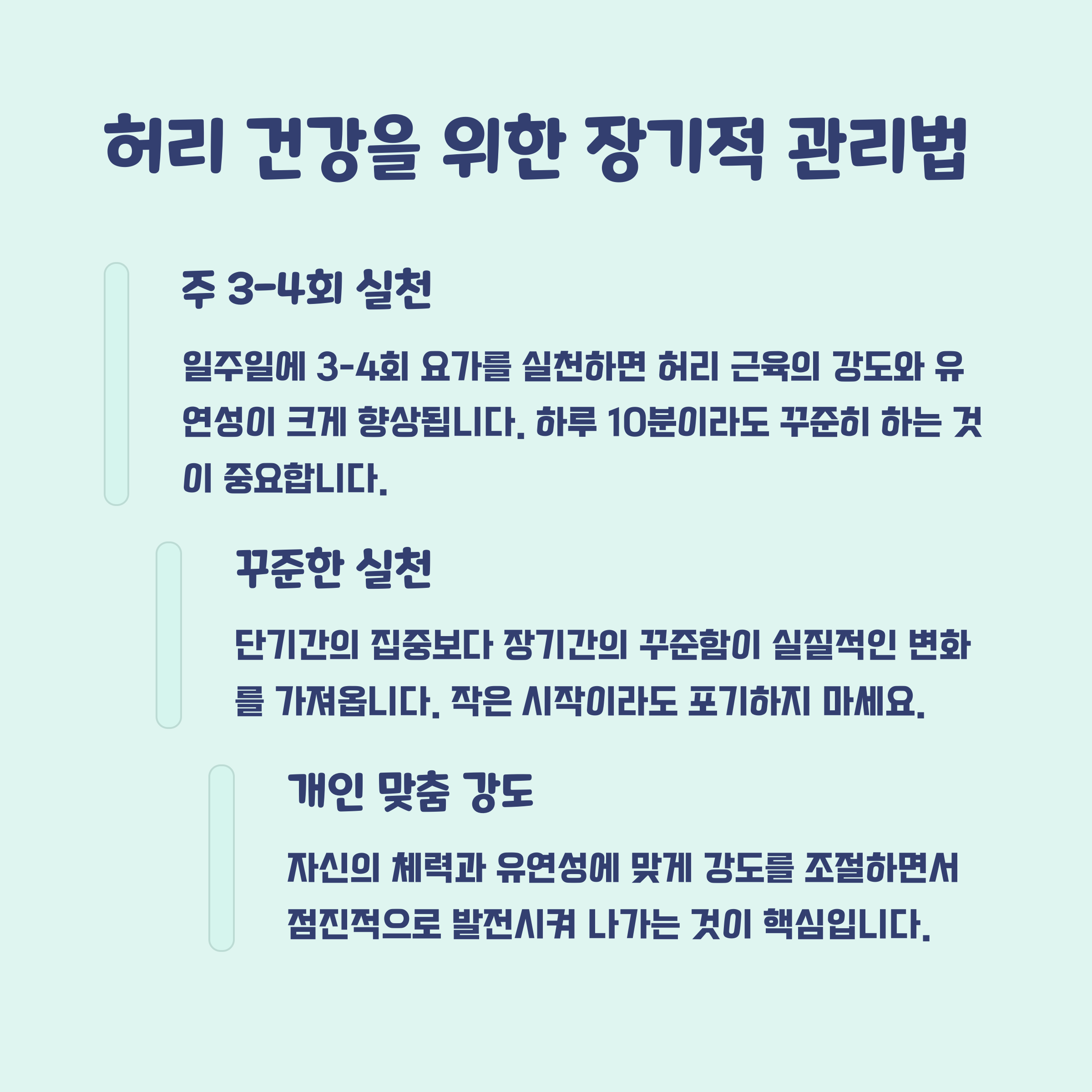 허리 통증 예방과 완화를 위해 하루 10분만 투자해 보세요. 위의 요가 루틴은 간단하지만 효과적이며, 꾸준히 실천하면 허리 건강뿐 아니라 전신 컨디션에도 긍정적인 변화를 가져올 것입니다. 오늘부터 시작해 보세요!