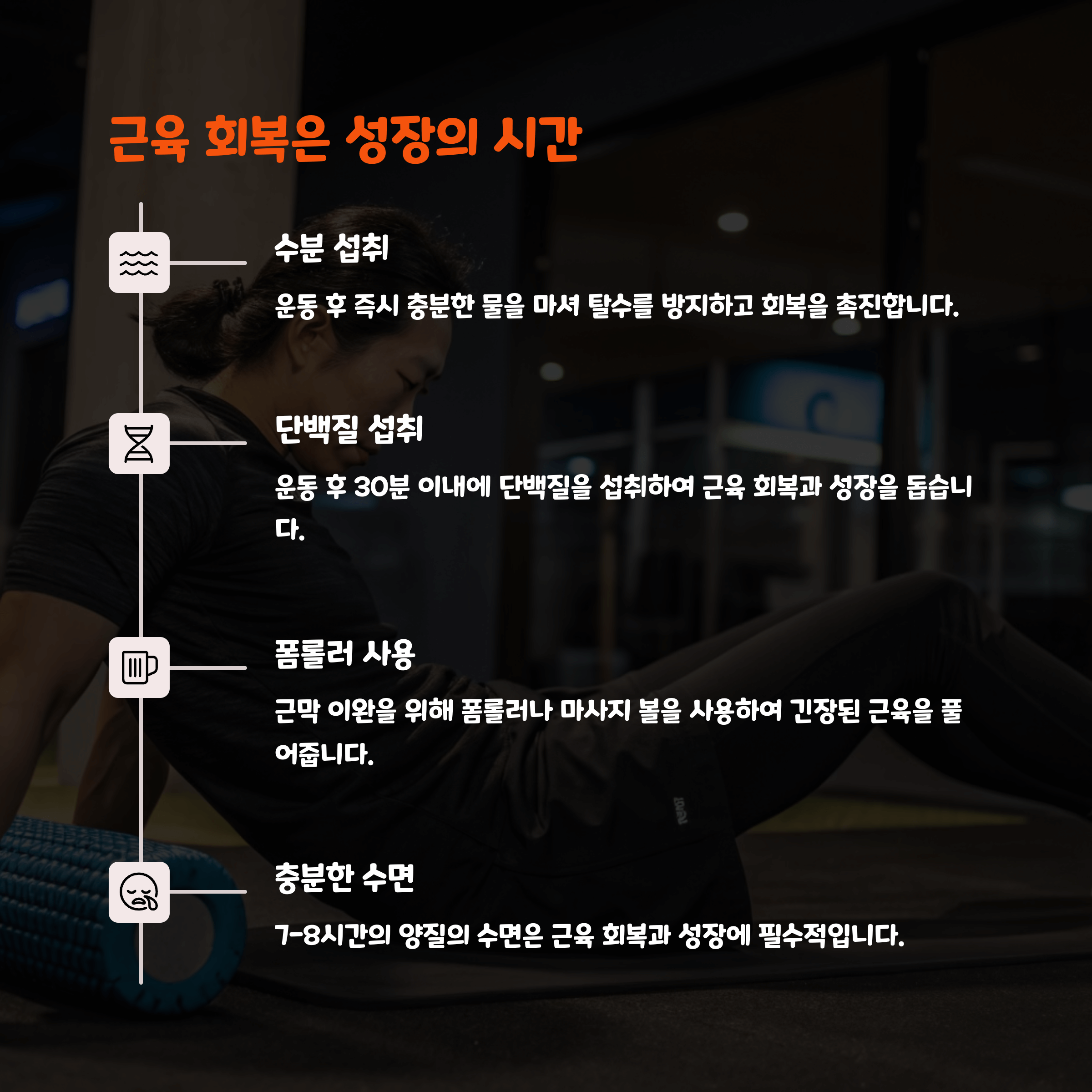 근육통이 심할 경우 충분한 스트레칭과 마사지를 통해 근육을 풀어주는 것이 중요합니다. 또한 폼롤러나 마사지 볼을 활용하여 뭉친 근육을 이완하고, 수분 섭취 및 단백질 보충을 통해 회복을 돕는 것이 효과적입니다.