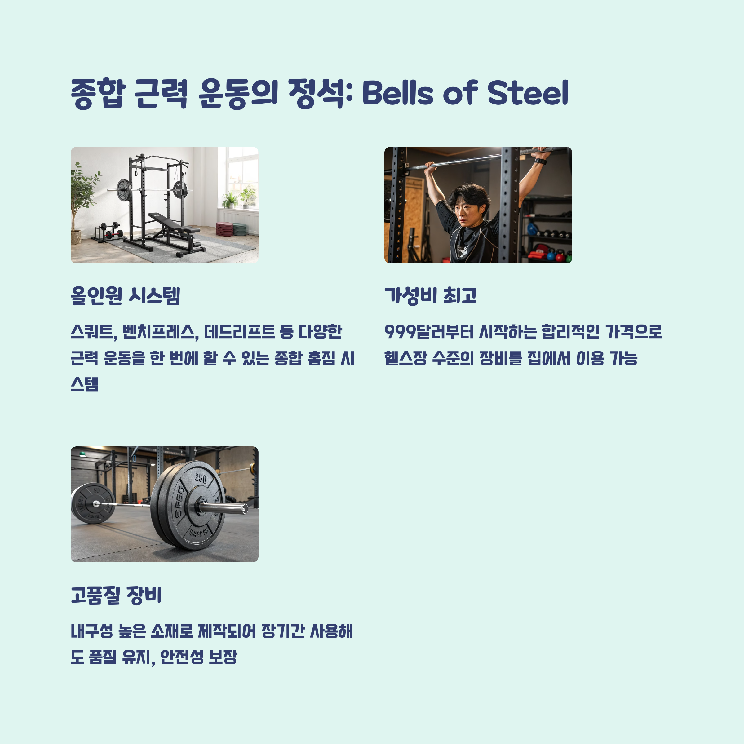 • 합리적인 가격에 다양한 근력 운동을 한 번에 하고 싶다면 Bells of Steel 올인원 홈짐이 적합합니다.
