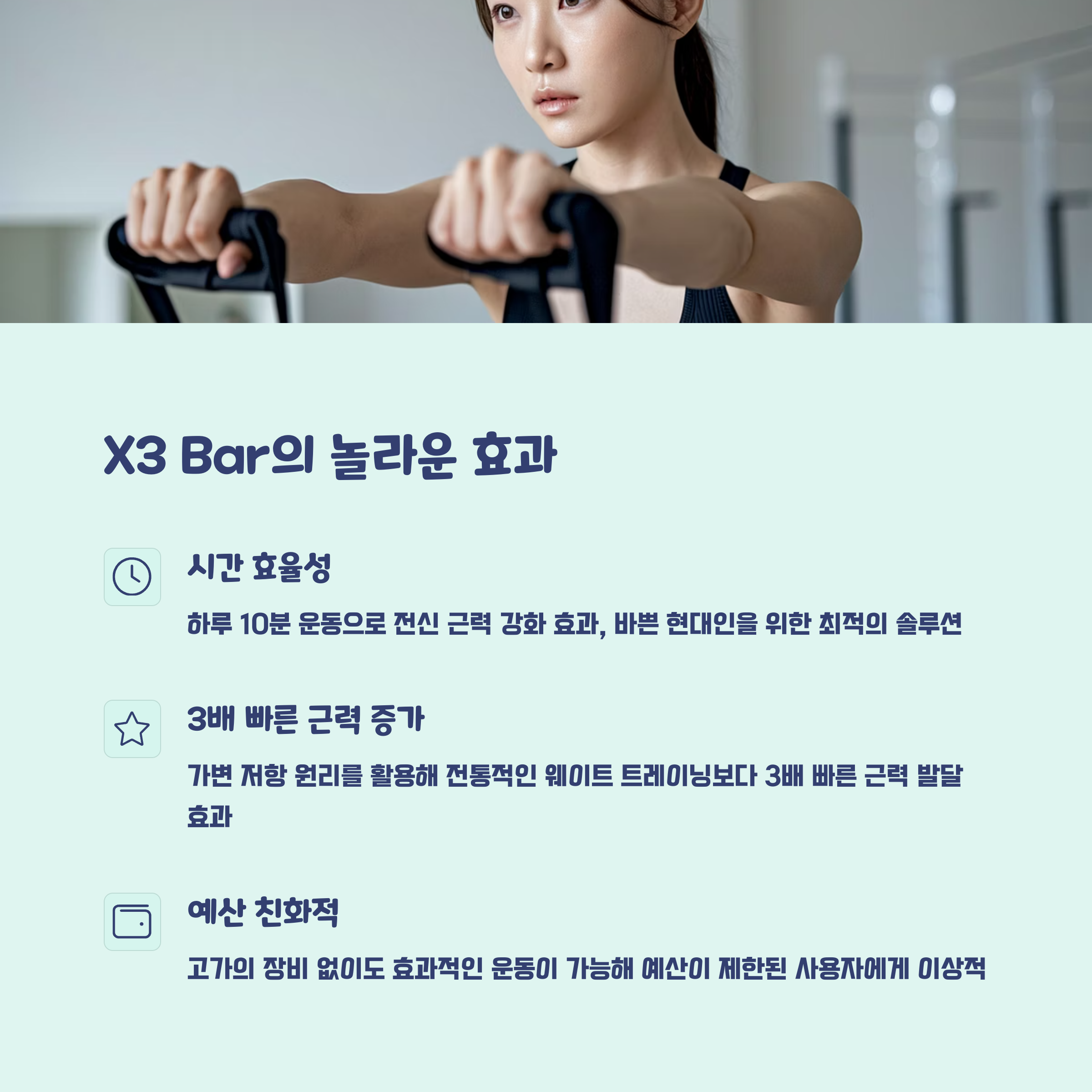 • X3 Bar는 공간과 예산이 제한된 분들에게 최고의 선택지로, 짧은 시간 내에 고강도 운동이 가능해 바쁜 현대인에게 특히 인기가 높습니다.