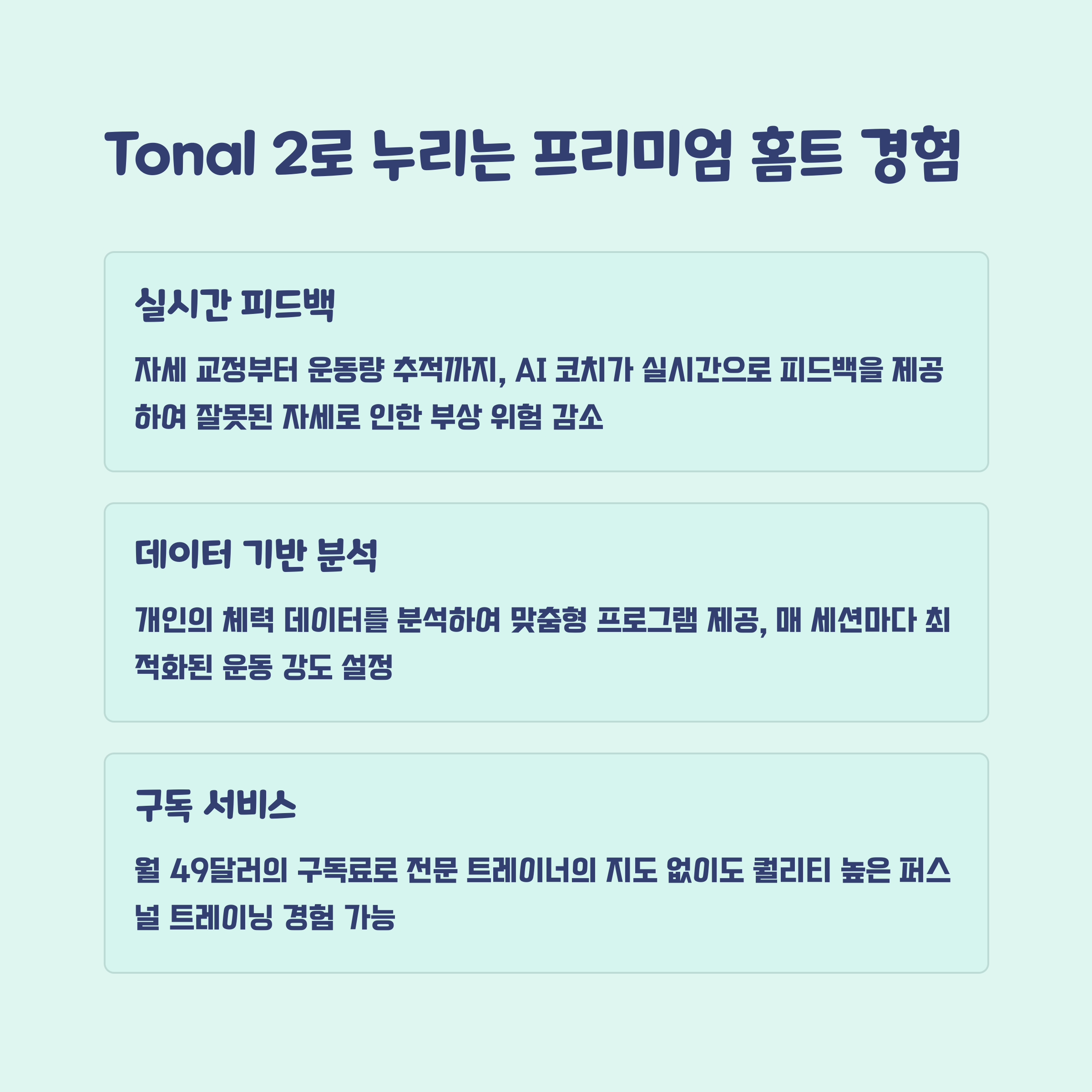 • Tonal 2는 첨단 기술과 맞춤형 트레이닝, 다양한 운동 프로그램으로 ‘투자 대비 효과’가 매우 높다는 평가를 받습니다.