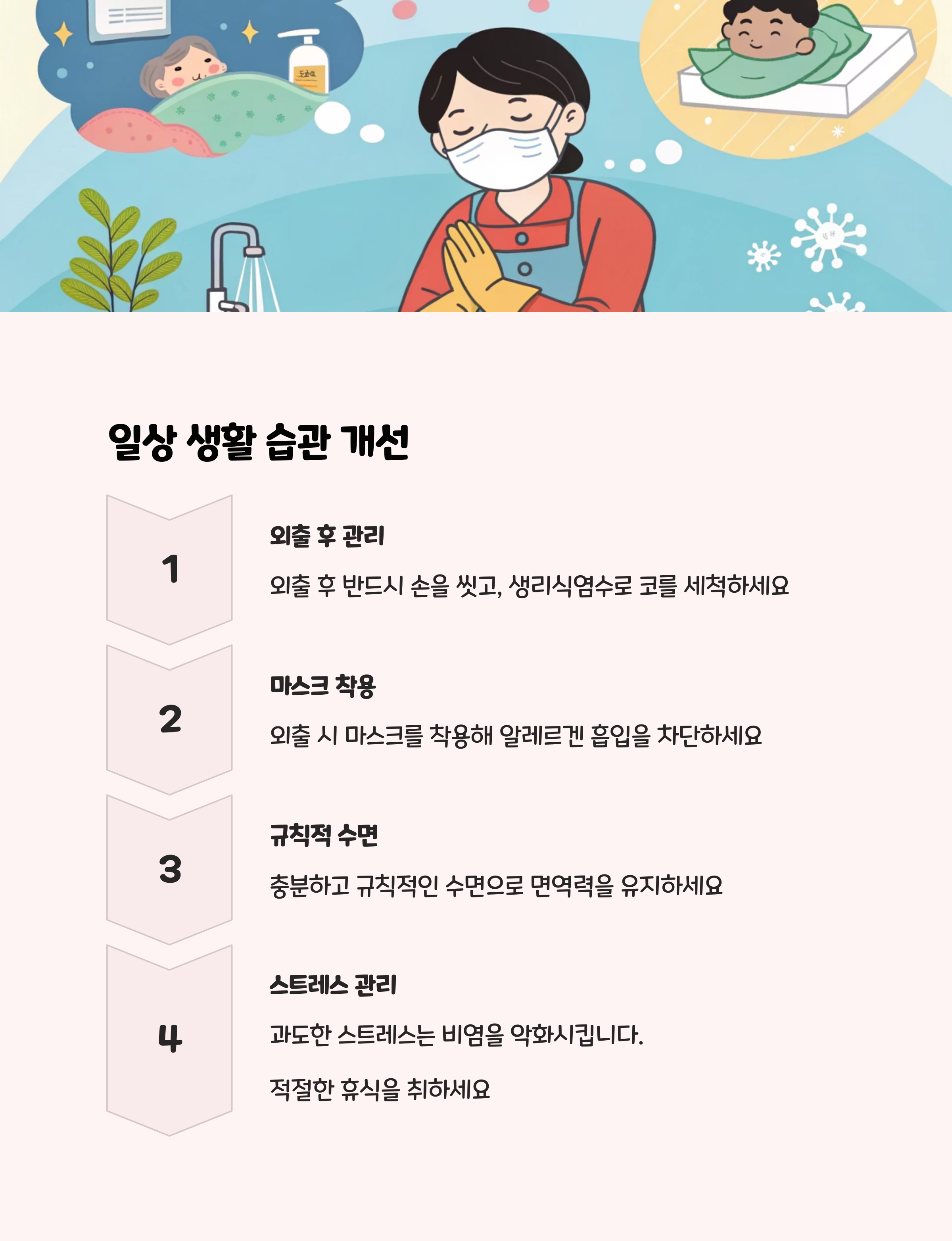 환절기 알레르기 비염은 삶의 질을 크게 떨어뜨릴 수 있지만, 천연 건강식품과 올바른 생활 습관만으로도 충분히 증상을 완화할 수 있습니다. 오늘 소개한 식품과 관리법을 일상에 조금씩 실천해 보세요. 작은 변화가 큰 건강의 차이를 만들어냅니다. 무엇보다 중요한 것은 자신의 몸에 맞는 방법을 꾸준히 찾고 실천하는 것입니다. 증상이 심하거나 개선이 느껴지지 않는다면 반드시 전문의와 상담하시길 권합니다. 여러분 모두가 건강하고 쾌적한 환절기를 보내시길 진심으로 응원합니다!