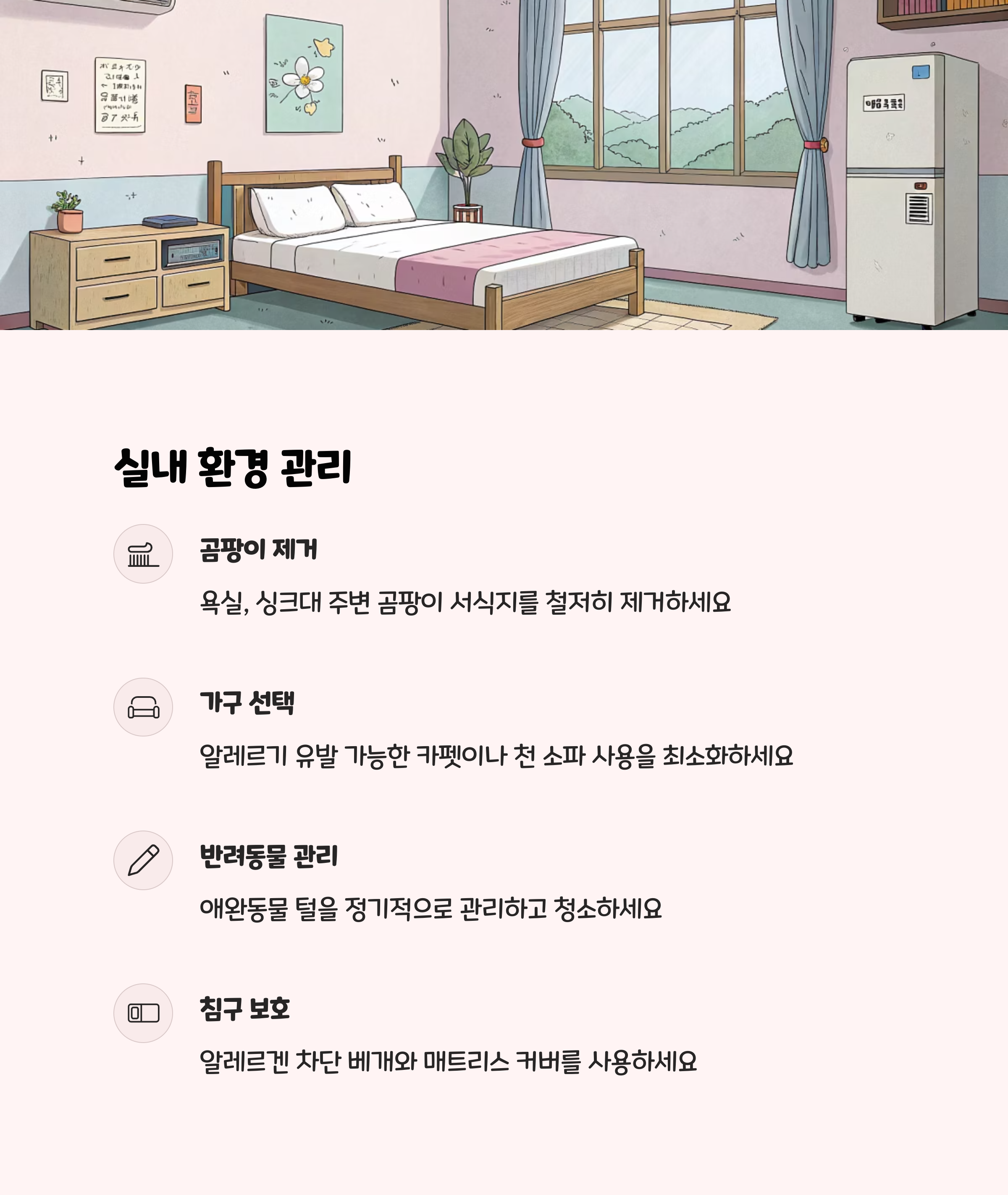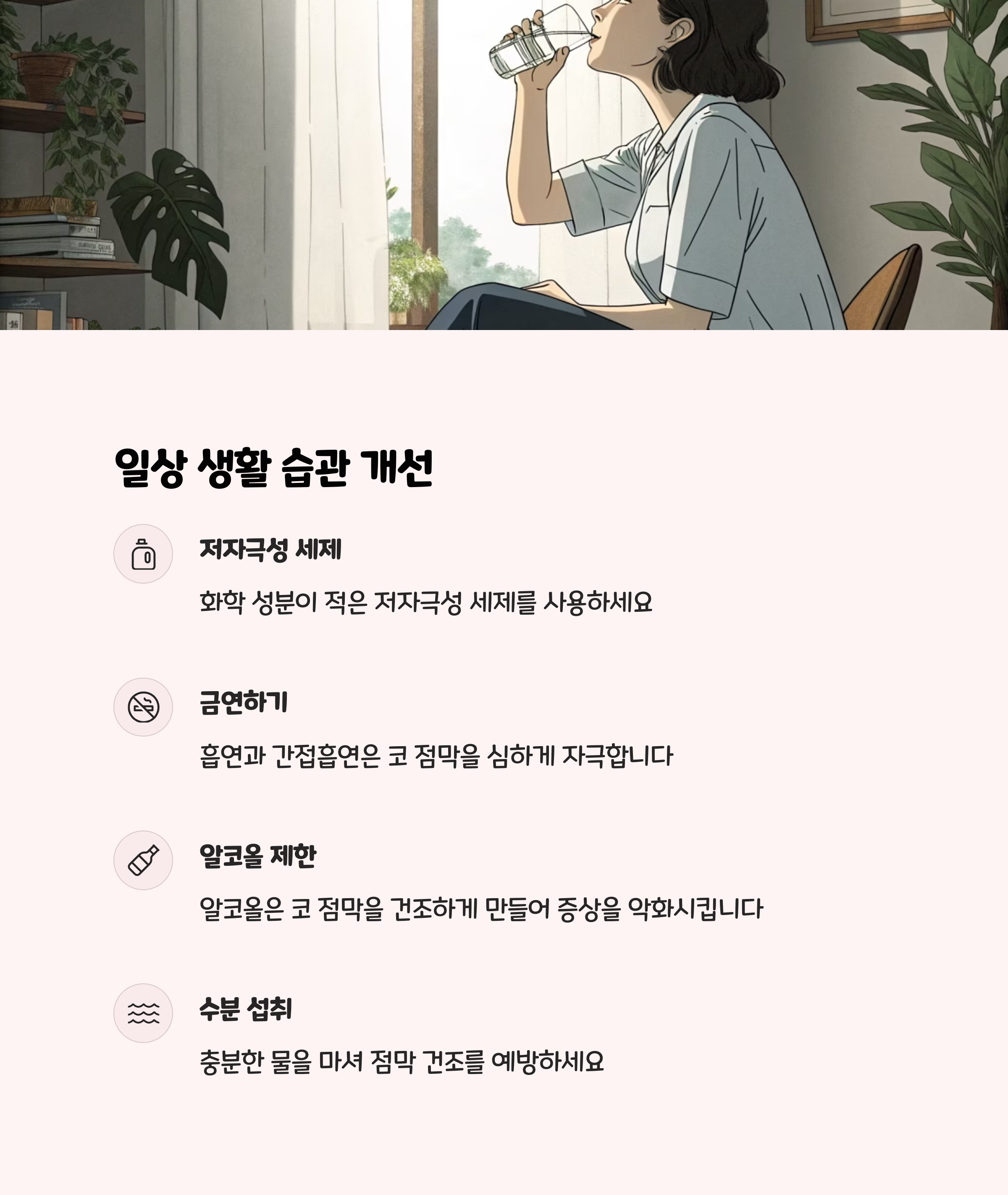 - 실내 습도 40~50% 유지 : 가습기나 젖은 수건을 활용하세요.