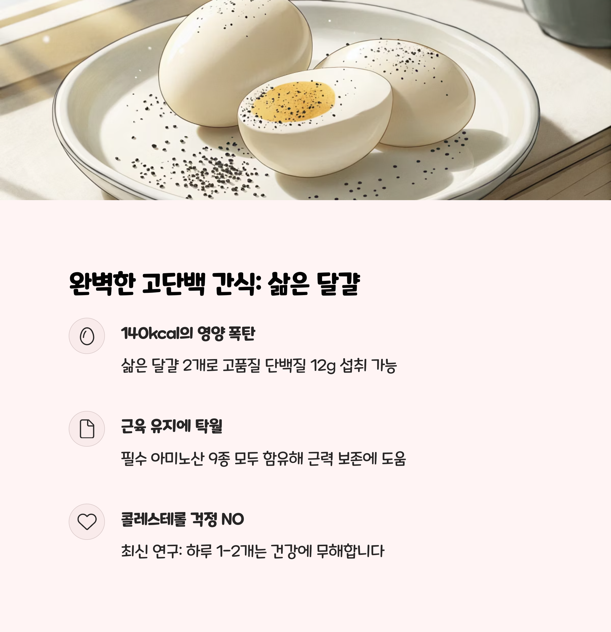 삶은 달걀 1개는 약 70kcal에 불과하지만, 단백질이 6g 정도 들어 있어 포만감을 오래 유지할 수 있습니다. 달걀은 단백질 외에도 콜린, 비타민 B12, 셀레늄 등 다양한 영양소가 풍부해 건강에 좋습니다. 간편하게 미리 삶아두고, 소금 없이 먹으면 더 건강하게 즐길 수 있습니다. 오이, 토마토, 샐러드와 함께 먹으면 칼로리 부담 없이 포만감을 더할 수 있습니다.