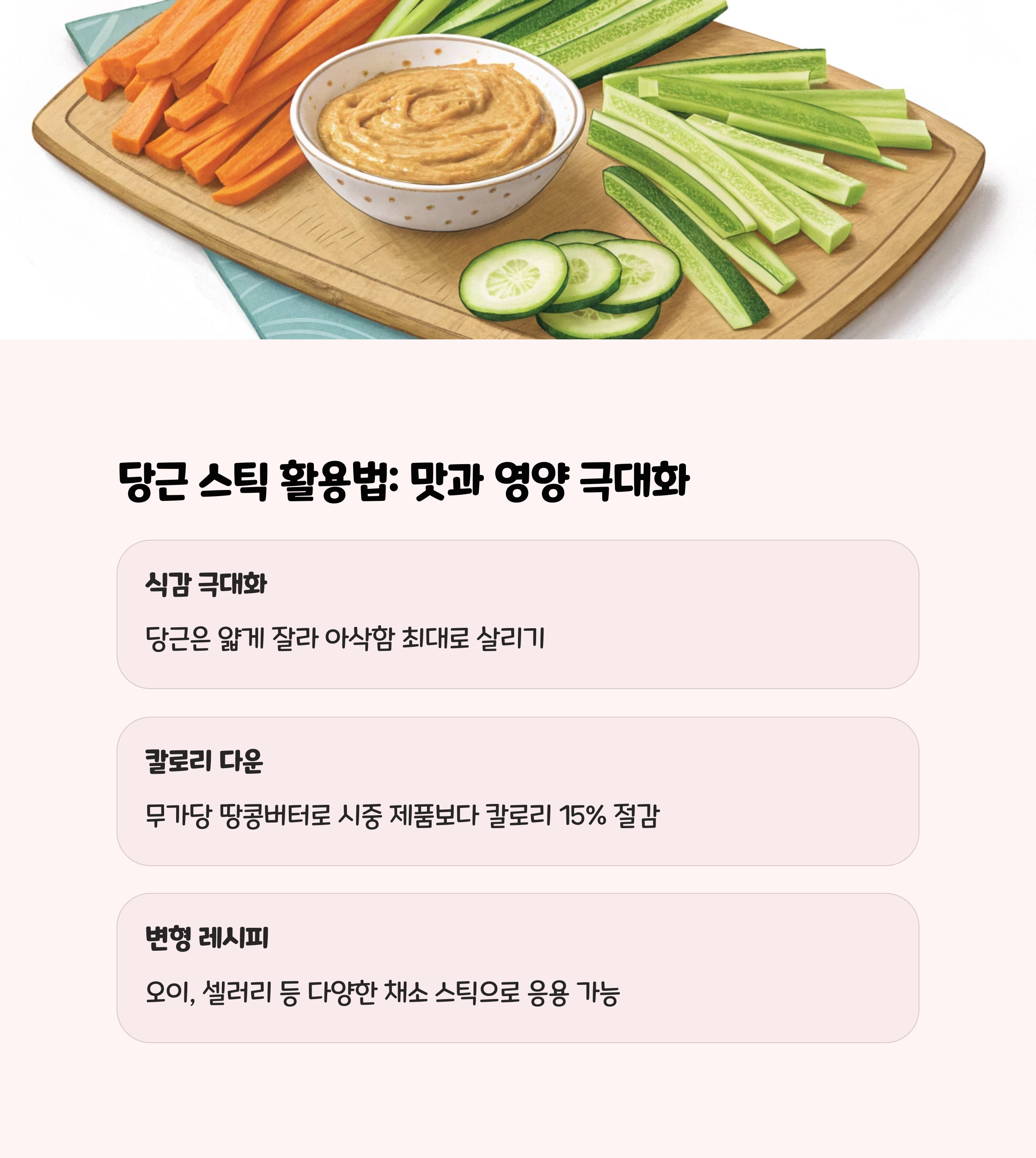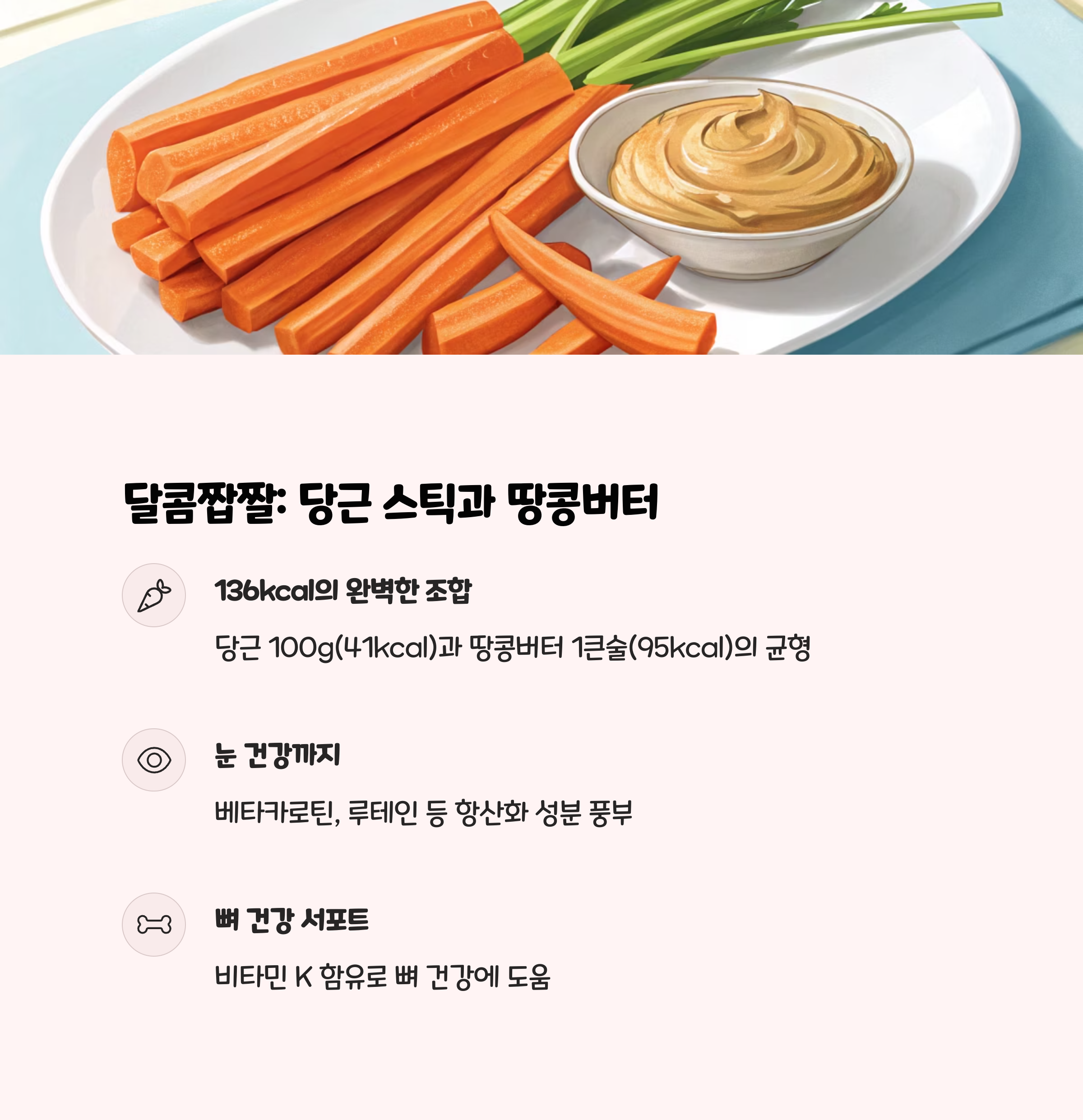 당근 스틱(약 50g, 20kcal)에 무가당 땅콩버터 1큰술(약 100kcal)을 찍어 먹으면, 총 약 120kcal로도 포만감을 느낄 수 있습니다. 당근은 식이섬유와 비타민이 풍부하고, 땅콩버터는 건강한 지방과 단백질이 많아 포만감을 오래 유지합니다. 이 조합은 간편하게 준비할 수 있고, 단맛과 고소함을 동시에 즐길 수 있습니다.