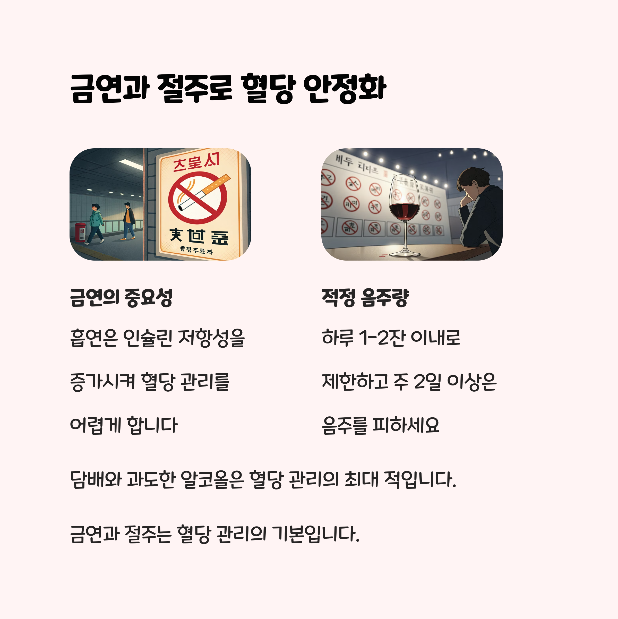 - 담배는 인슐린 분비를 저해하고 저항성을 높입니다. 반드시 금연하세요.