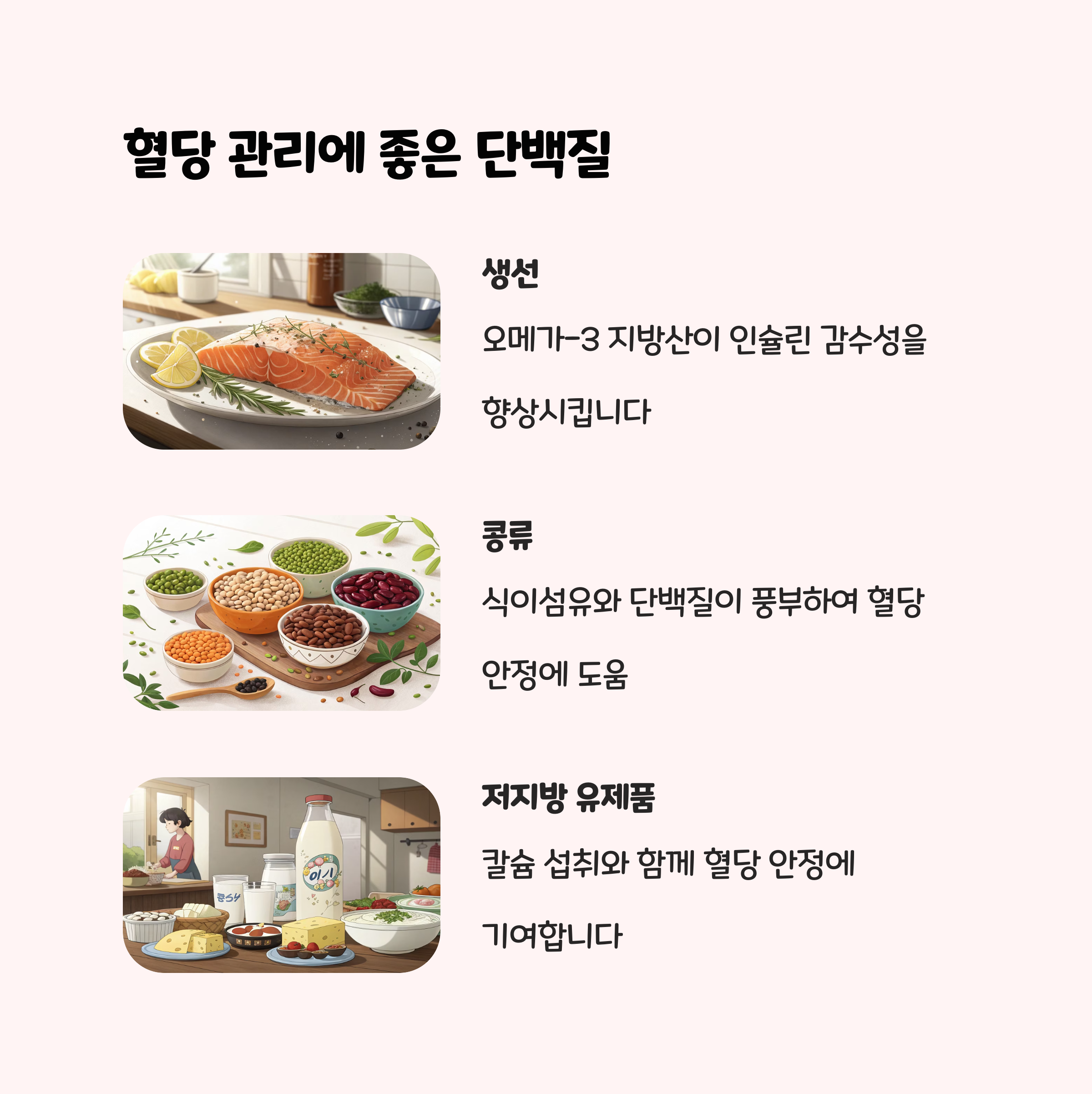 - 견과류, 생선: 불포화지방산이 많아 심혈관 건강과 혈당 안정에 도움을 줍니다.