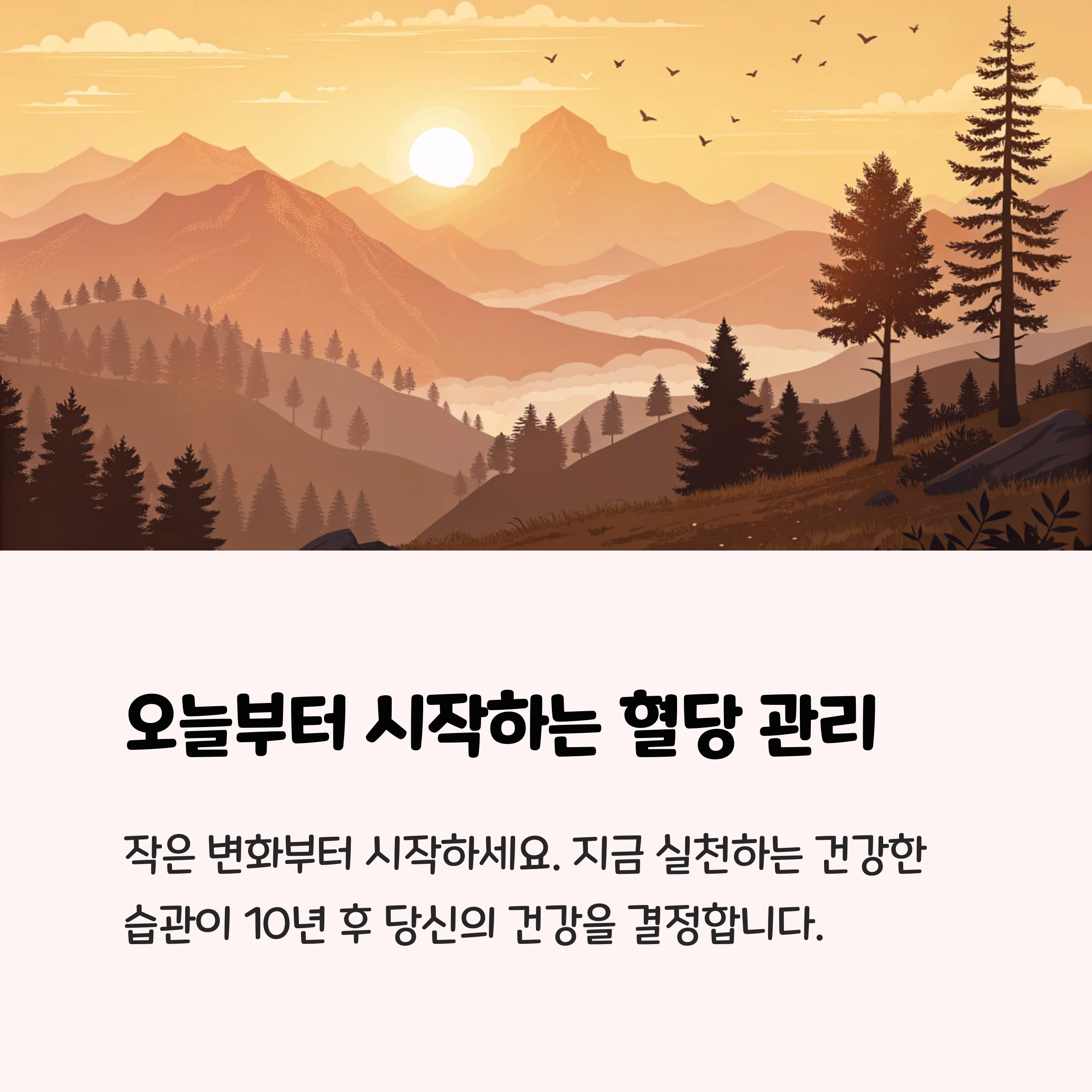- 수면 부족은 스트레스 호르몬을 증가시켜 혈당 조절을 어렵게 만듭니다. 하루 7~8시간 수면을 지키세요.