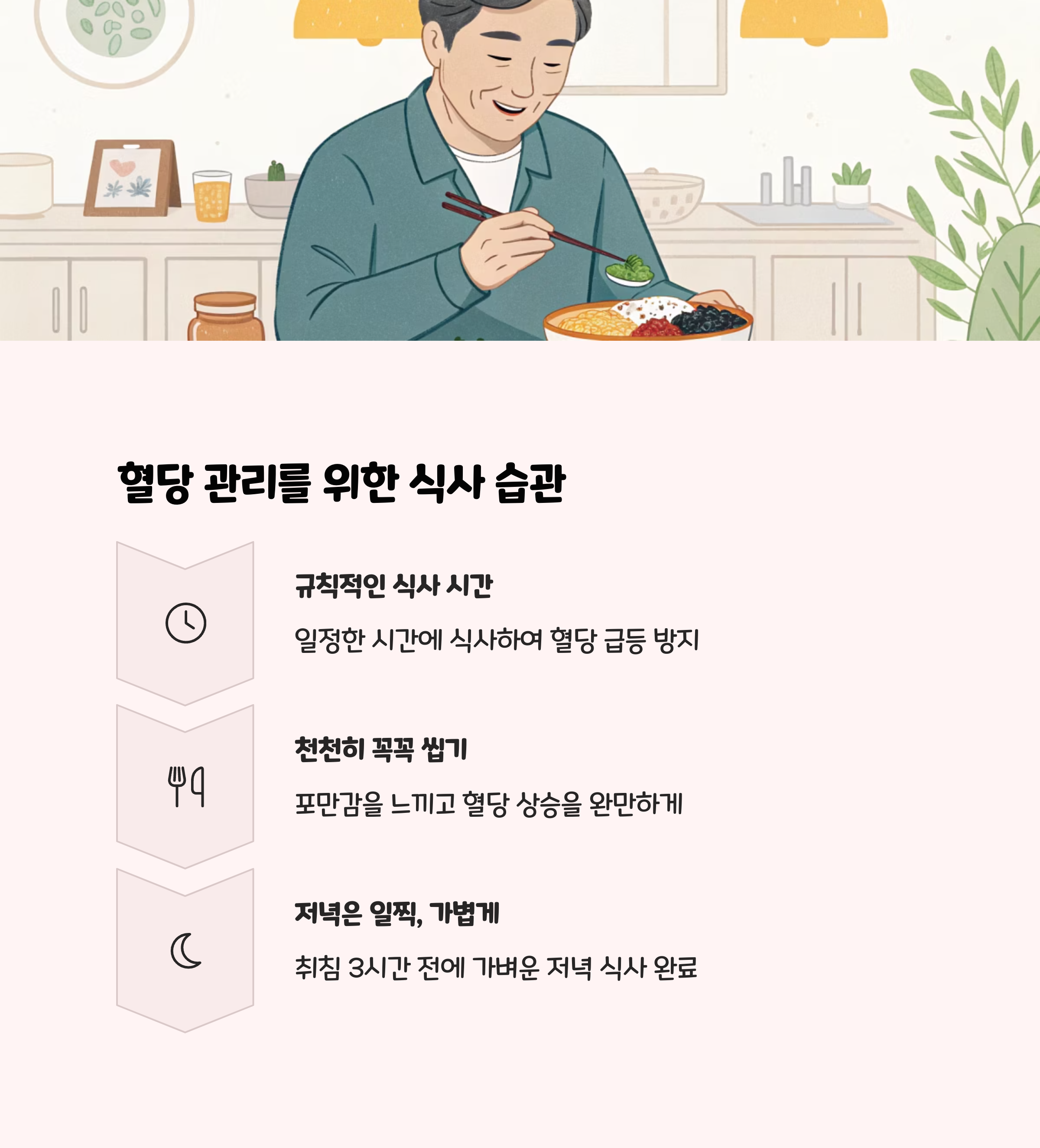 - 아침을 꼭 챙겨 먹고, 식사는 20분 이상 천천히 하세요. 불규칙한 식사는 혈당을 급격히 올릴 수 있습니다.
