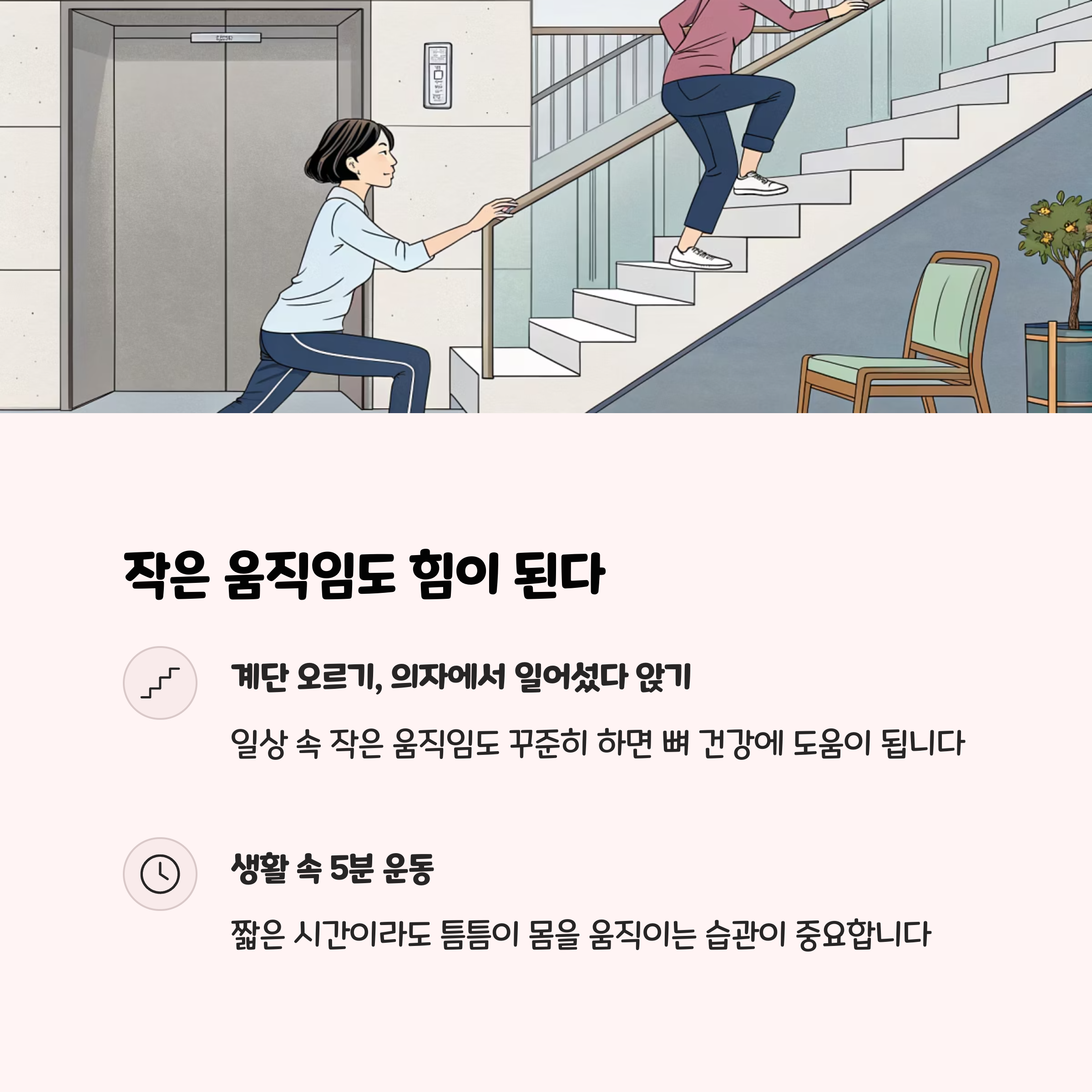 - 집안일, 계단 이용 : 생활 속 작은 움직임도 뼈 건강에 도움이 됩니다.