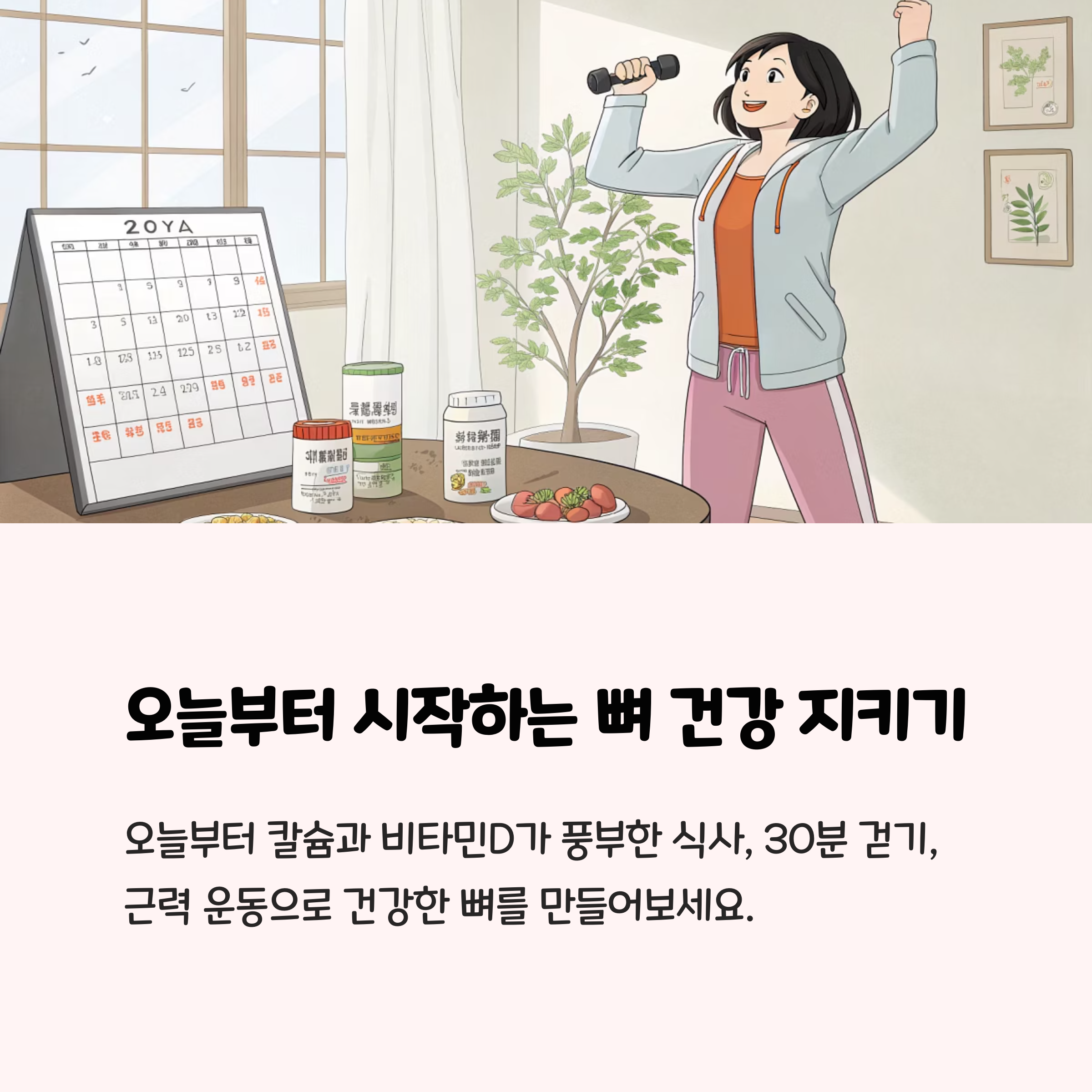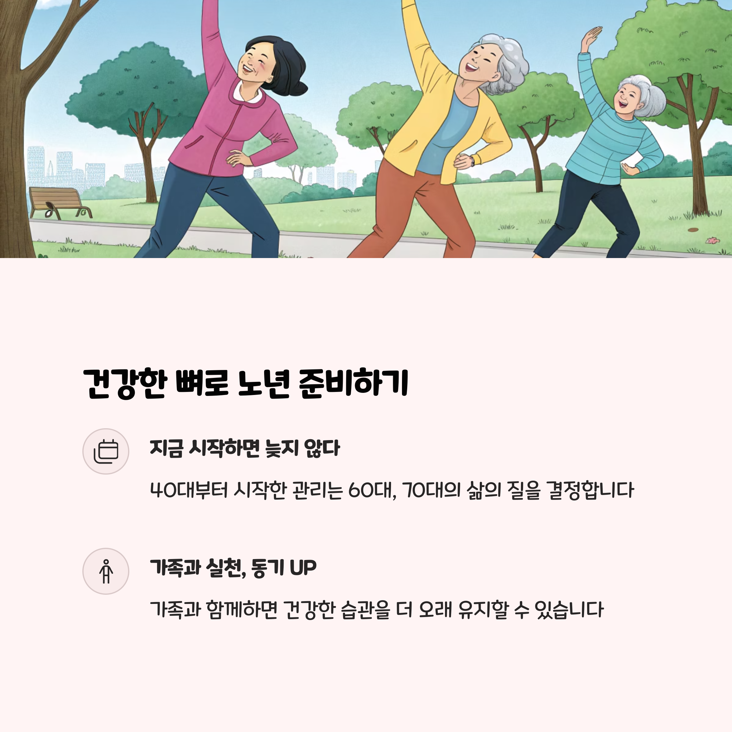 골밀도 관리는 40대부터 시작해야 효과적입니다. 칼슘, 비타민 D, 단백질이 풍부한 식단과 꾸준한 운동, 올바른 생활습관이 건강한 뼈와 활기찬 삶의 비결입니다. 지금 당장 한 가지라도 실천해보세요. 작은 변화가 쌓이면, 10년 뒤 내 몸이 달라집니다.