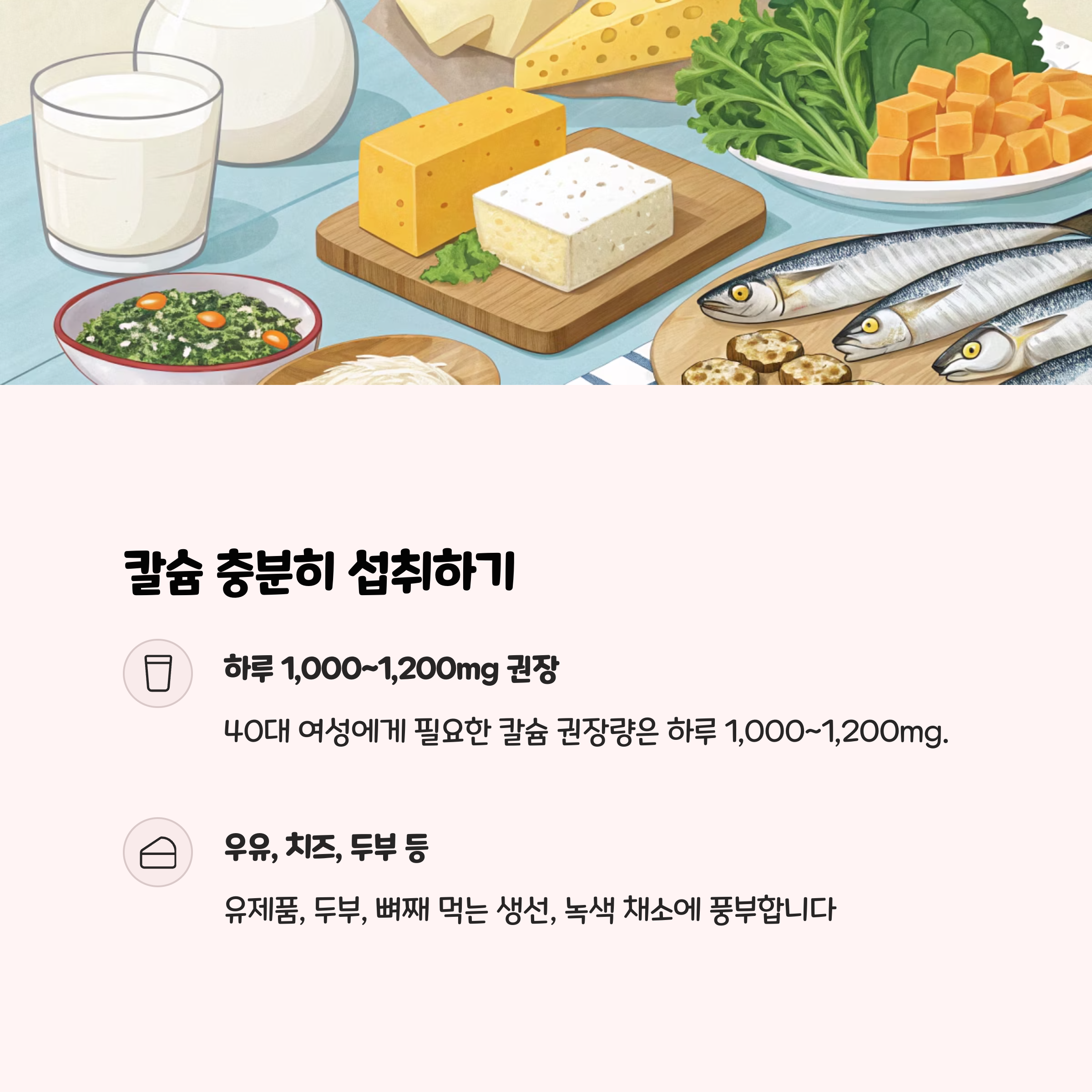 - 칼슘 섭취량 : 40대 한국 여성의 평균 칼슘 섭취량은 권장량의 70% 수준에 불과해, 의식적으로 보충이 필요합니다.