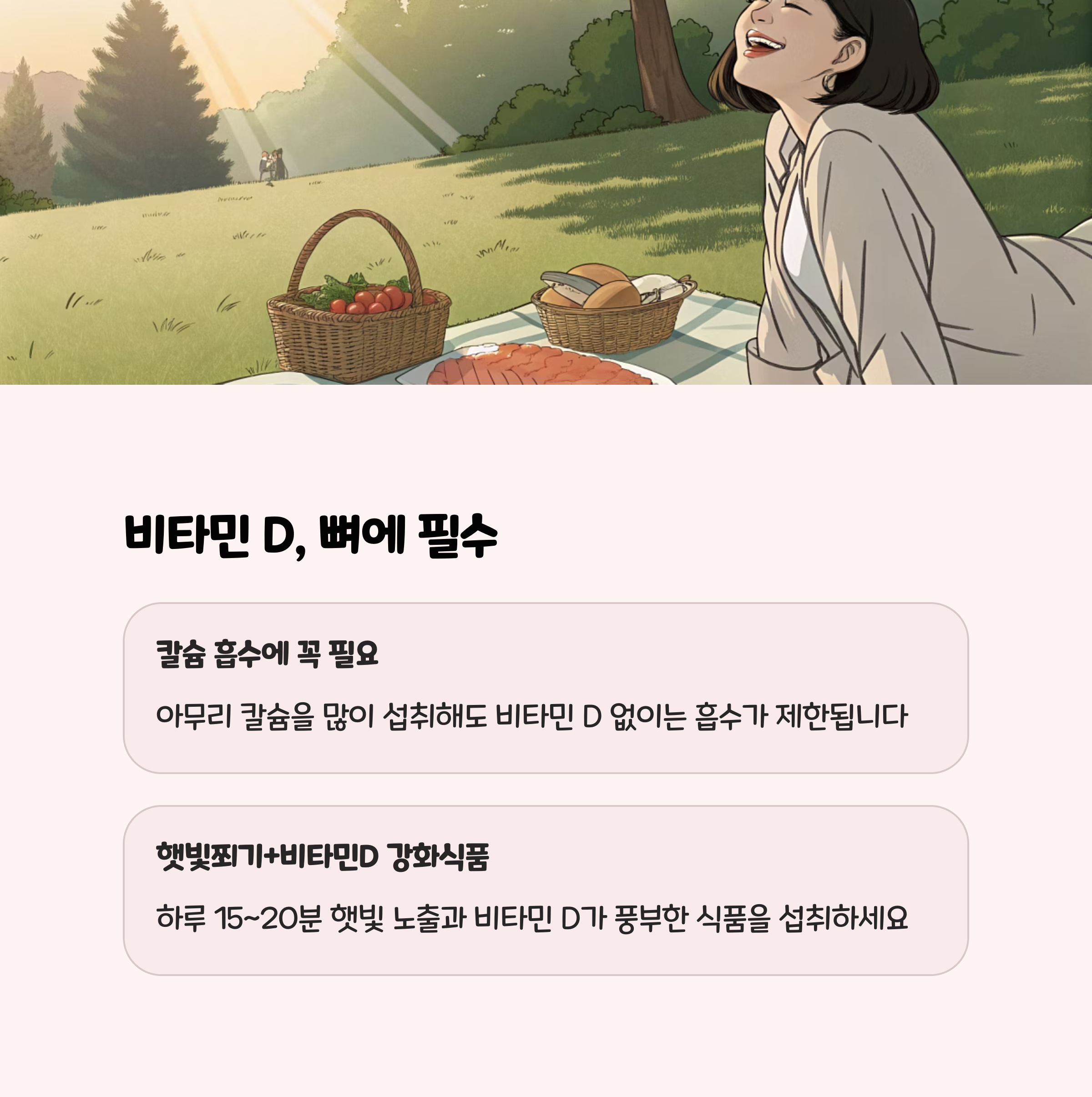 - 비타민 D : 칼슘이 뼈에 잘 흡수되려면 비타민 D가 꼭 필요합니다. 비타민 D는 연어, 고등어, 계란 노른자, 표고버섯 등에 풍부하며, 햇볕을 쬐는 것도 좋은 방법입니다.