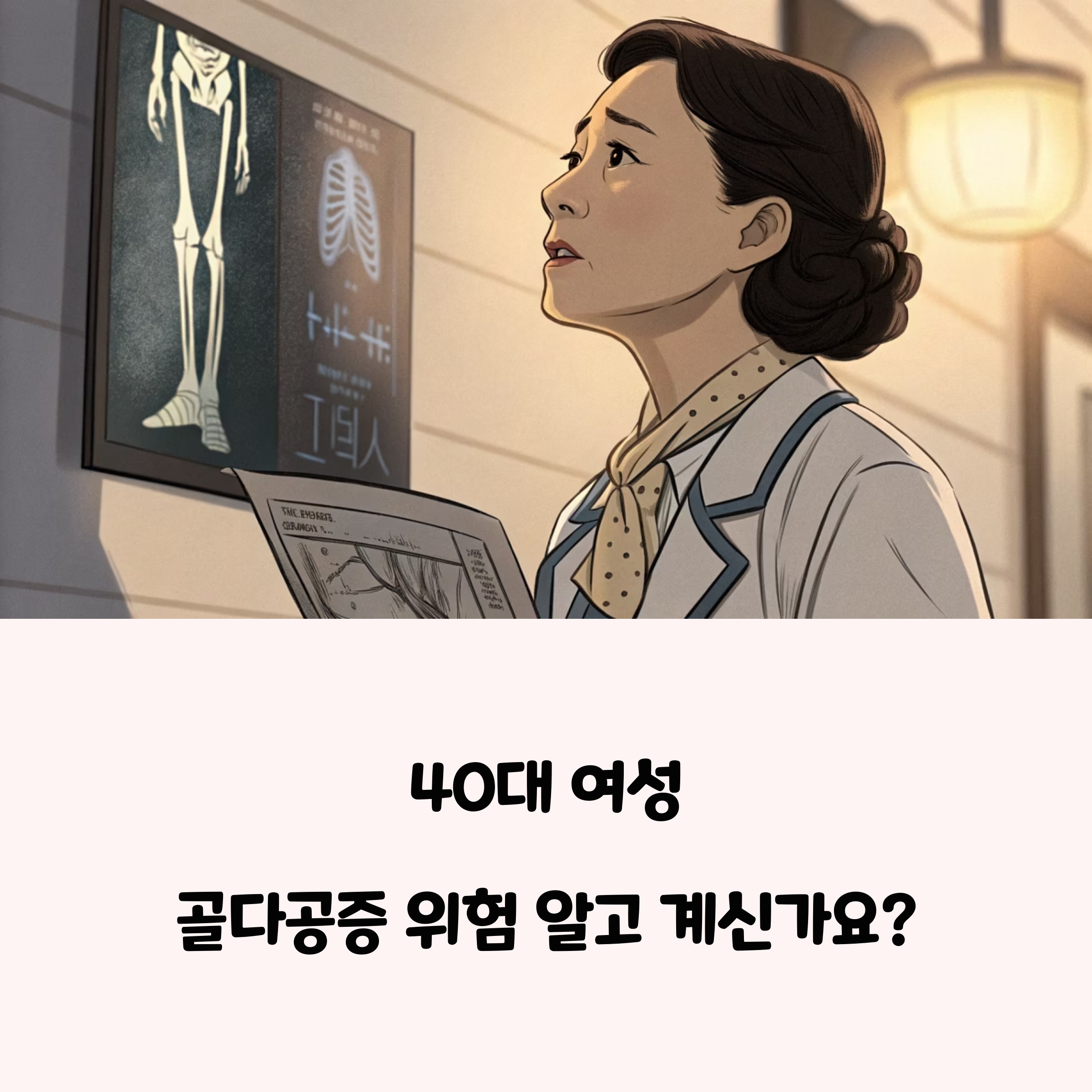40대 이후 여성은 폐경 전후로 여성호르몬(에스트로겐) 분비가 줄어듭니다. 이 호르몬은 뼈를 만드는 세포의 활동을 돕고, 뼈를 파괴하는 세포의 활동을 억제합니다. 호르몬이 줄면 뼈 소실이 빨라져 골밀도가 급격히 감소합니다.