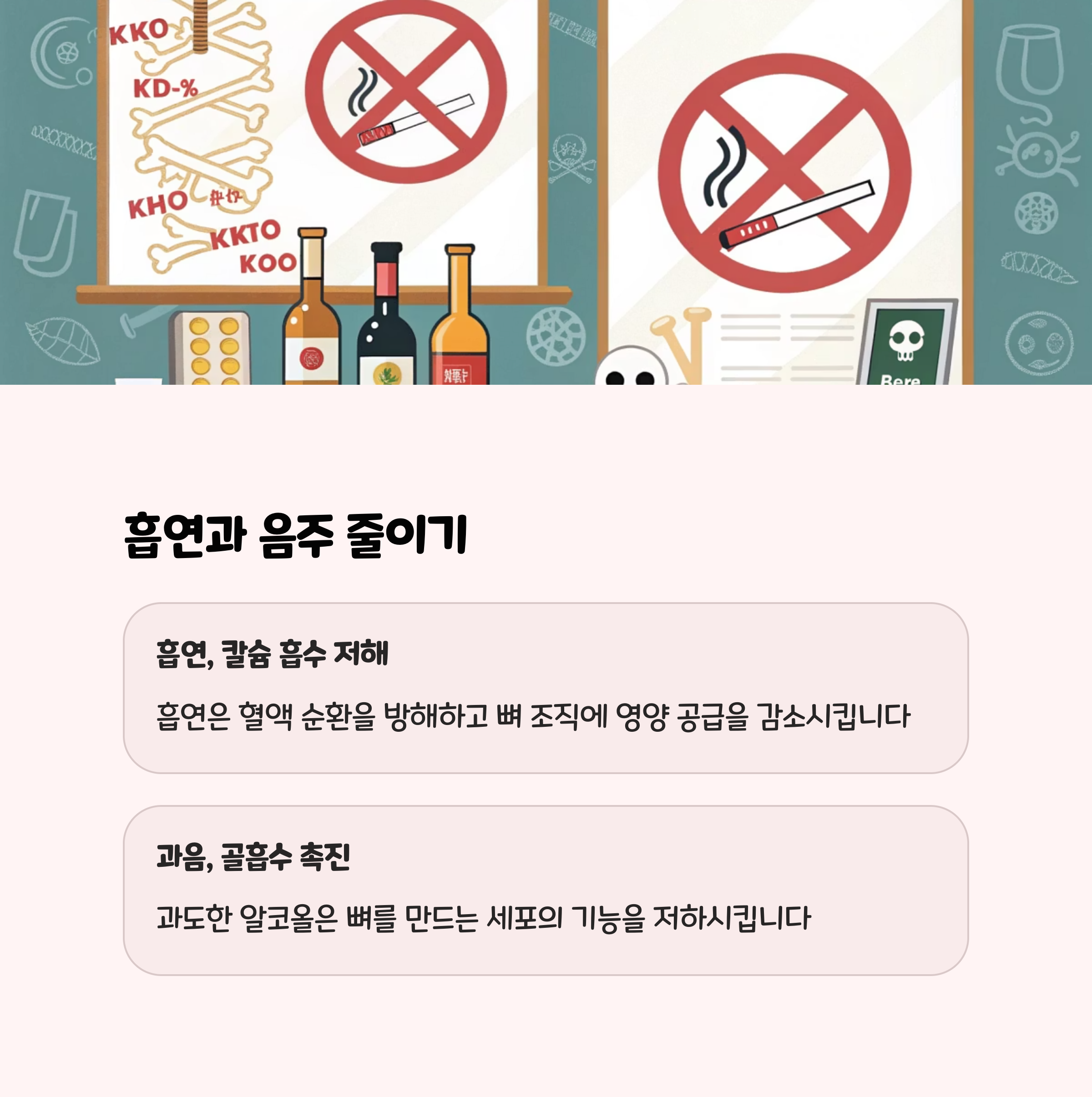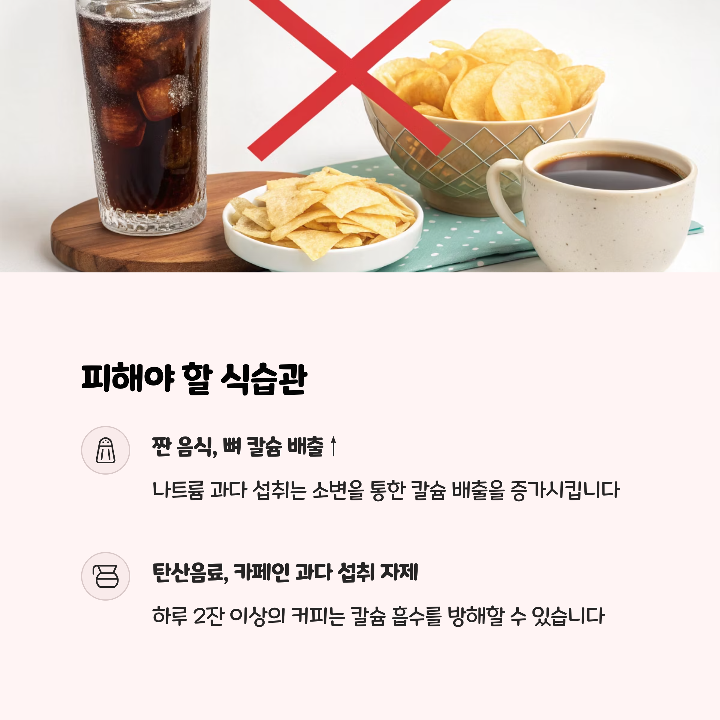 - 짠 음식 줄이기 : 고염분 식단은 신장에서 칼슘 배출을 증가시켜 골밀도를 낮춥니다. 국물류, 절임류, 가공식품 섭취를 줄이세요.