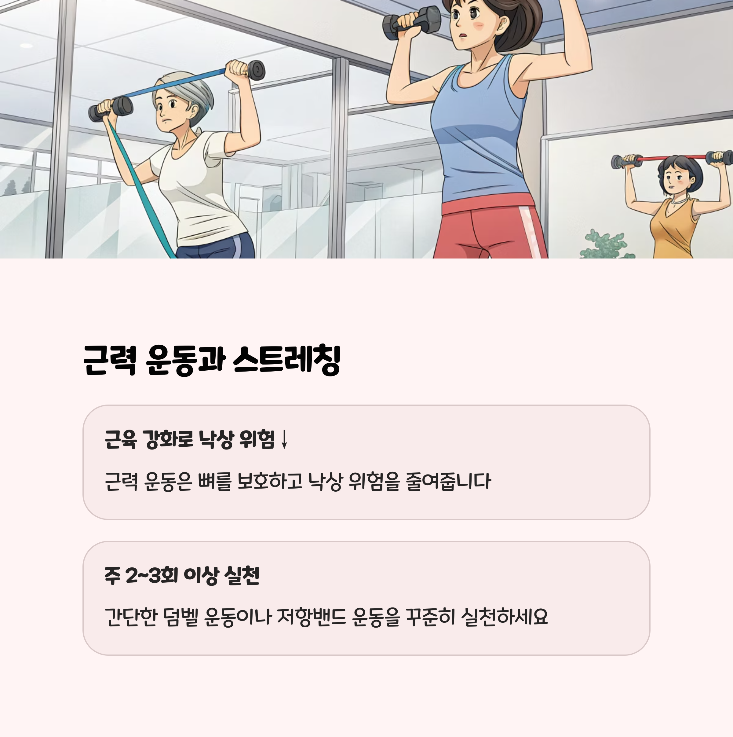 - 근력 운동 : 근육이 강해지면 뼈에 가해지는 부담이 줄어들고, 낙상 위험도 감소합니다. 스쿼트, 런지, 플랭크, 아령 들기 등 집에서도 쉽게 할 수 있는 동작부터 시작하세요. 일주일에 2회 이상, 한 번에 20~30분씩 꾸준히 실시하면 효과적입니다.