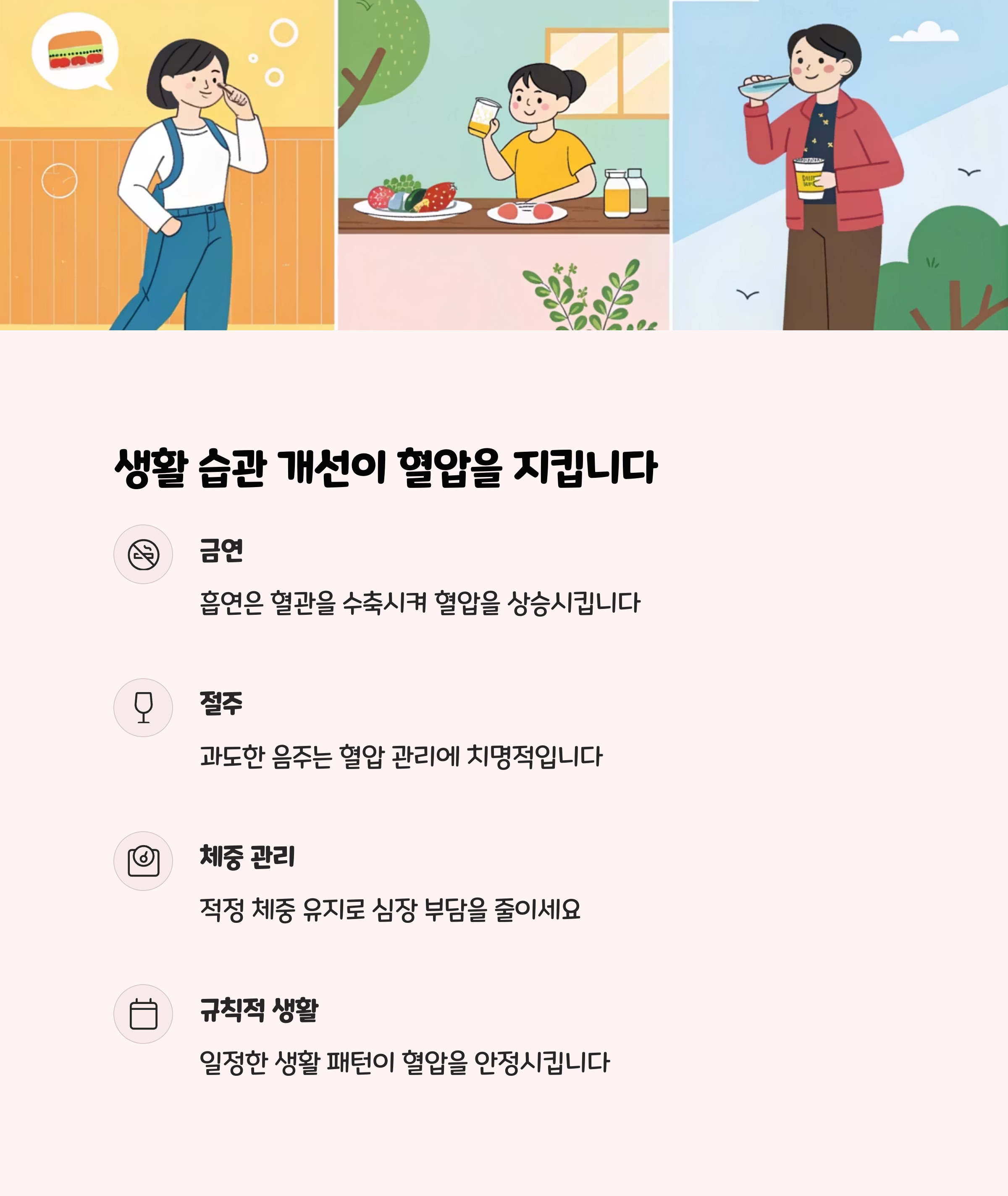- 금연과 절주 : 흡연과 과음은 혈관 건강을 해치고 혈압을 올릴 수 있습니다.