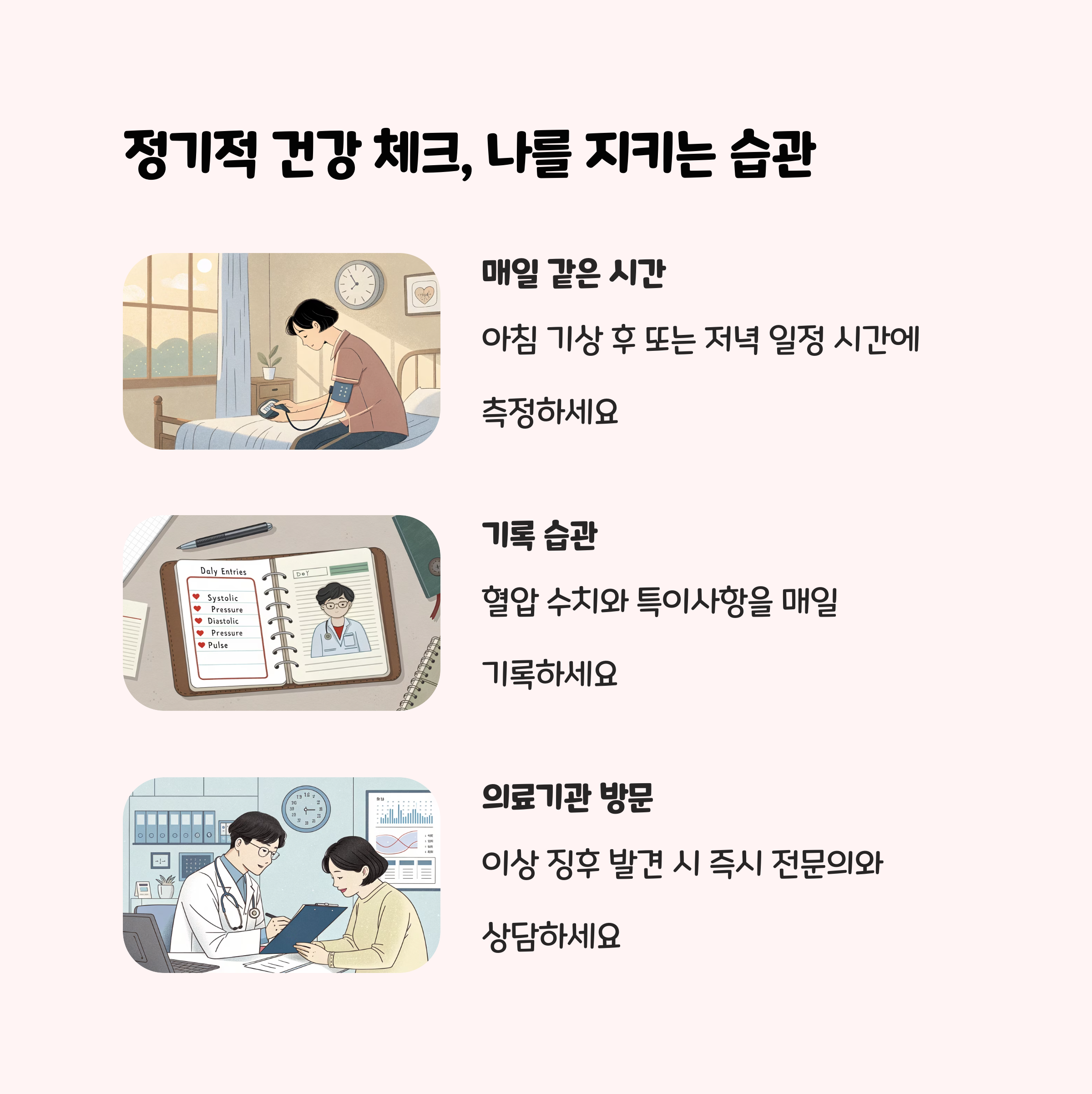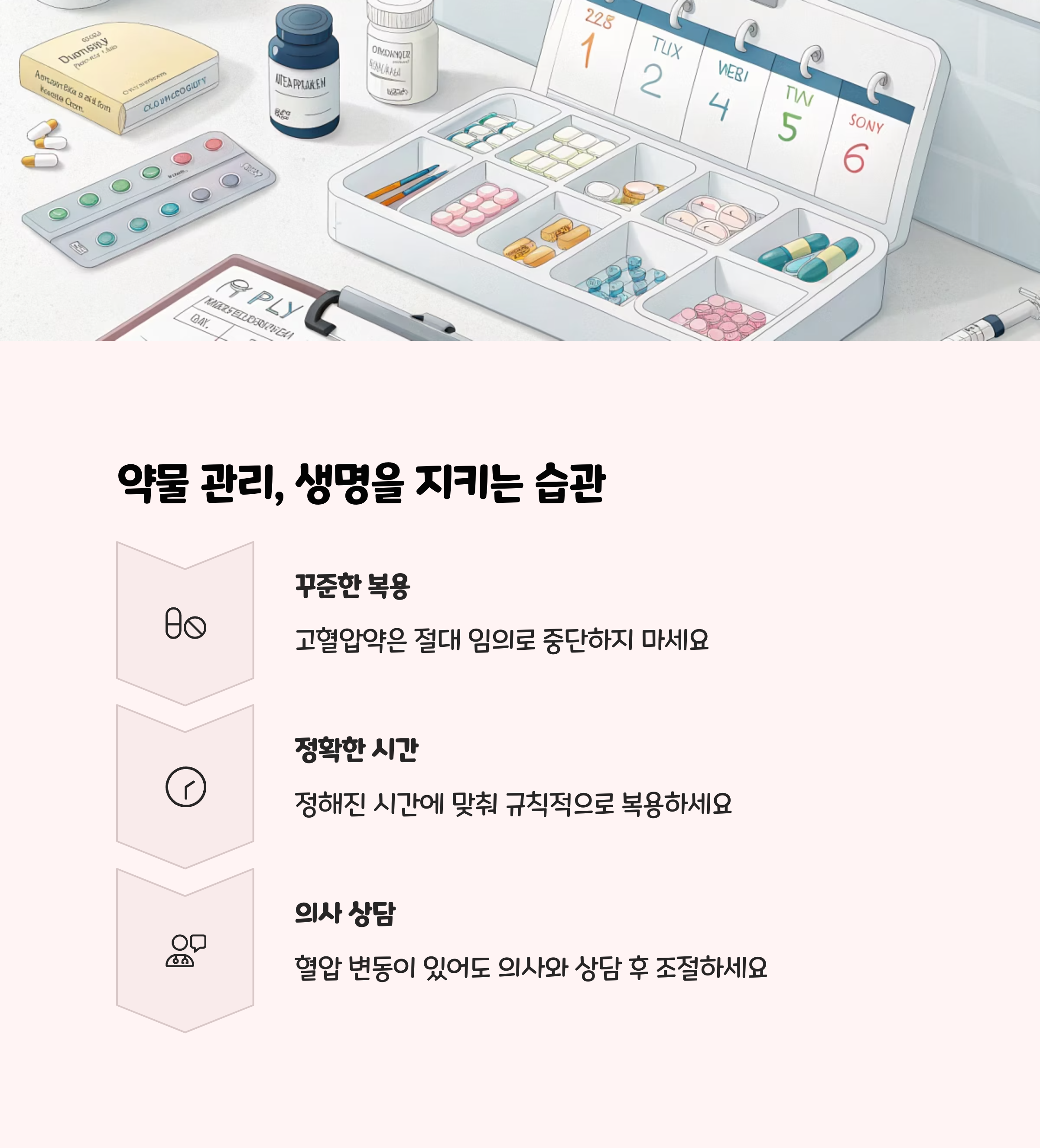 여름철에는 혈압이 낮아질 수 있다는 오해로 약 복용을 소홀히 하는 경우가 있습니다. 하지만 혈압약은 반드시 꾸준히 복용해야 하며, 복용 중 이상 증상이 있으면 의료진과 상담하세요. 또한, 정기적으로 혈압, 혈당, 콜레스테롤 등 건강 상태를 체크하고, 필요시 진료를 받는 것이 중요합니다.