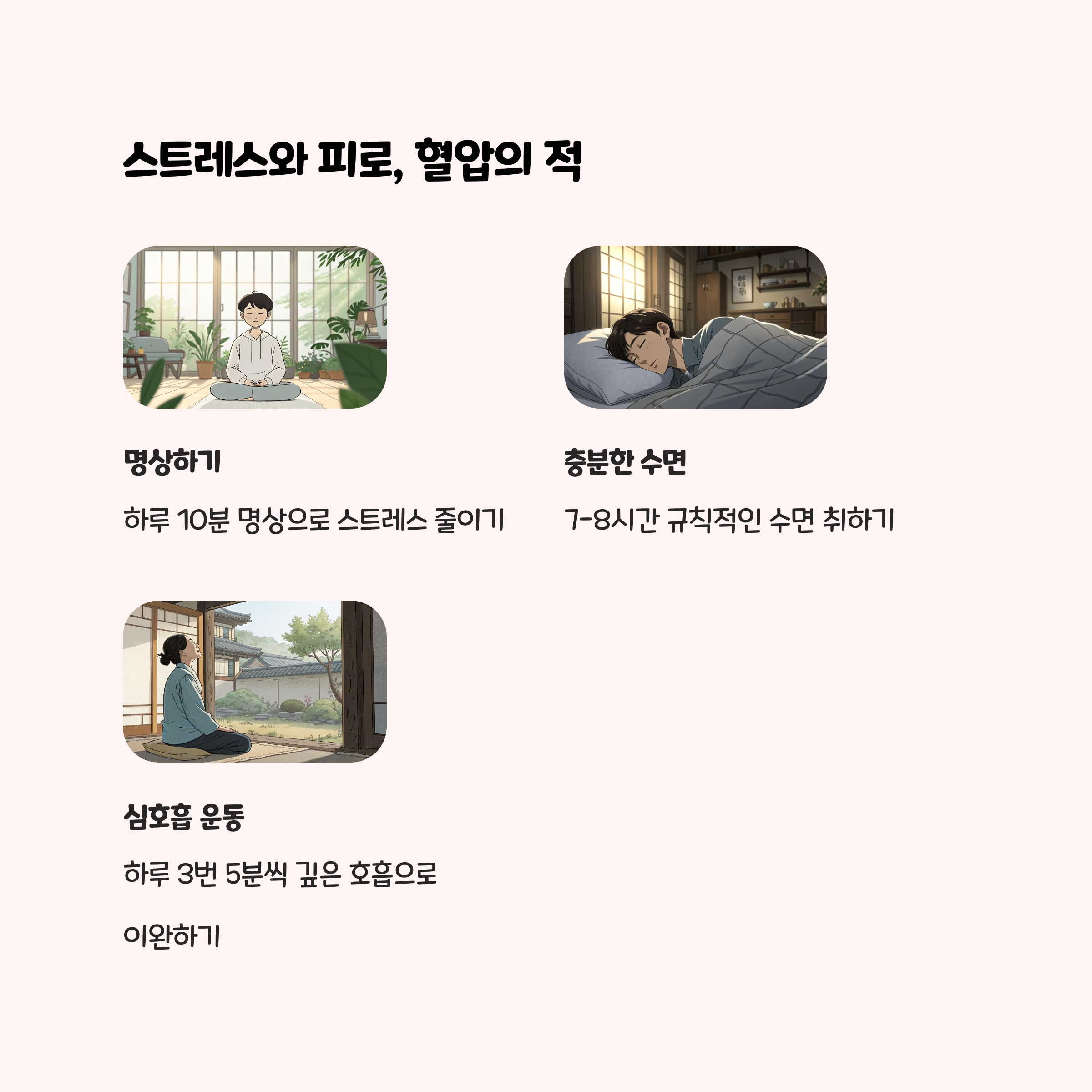 - 충분한 수면 : 수면 부족은 혈압을 높이는 주요 원인입니다.