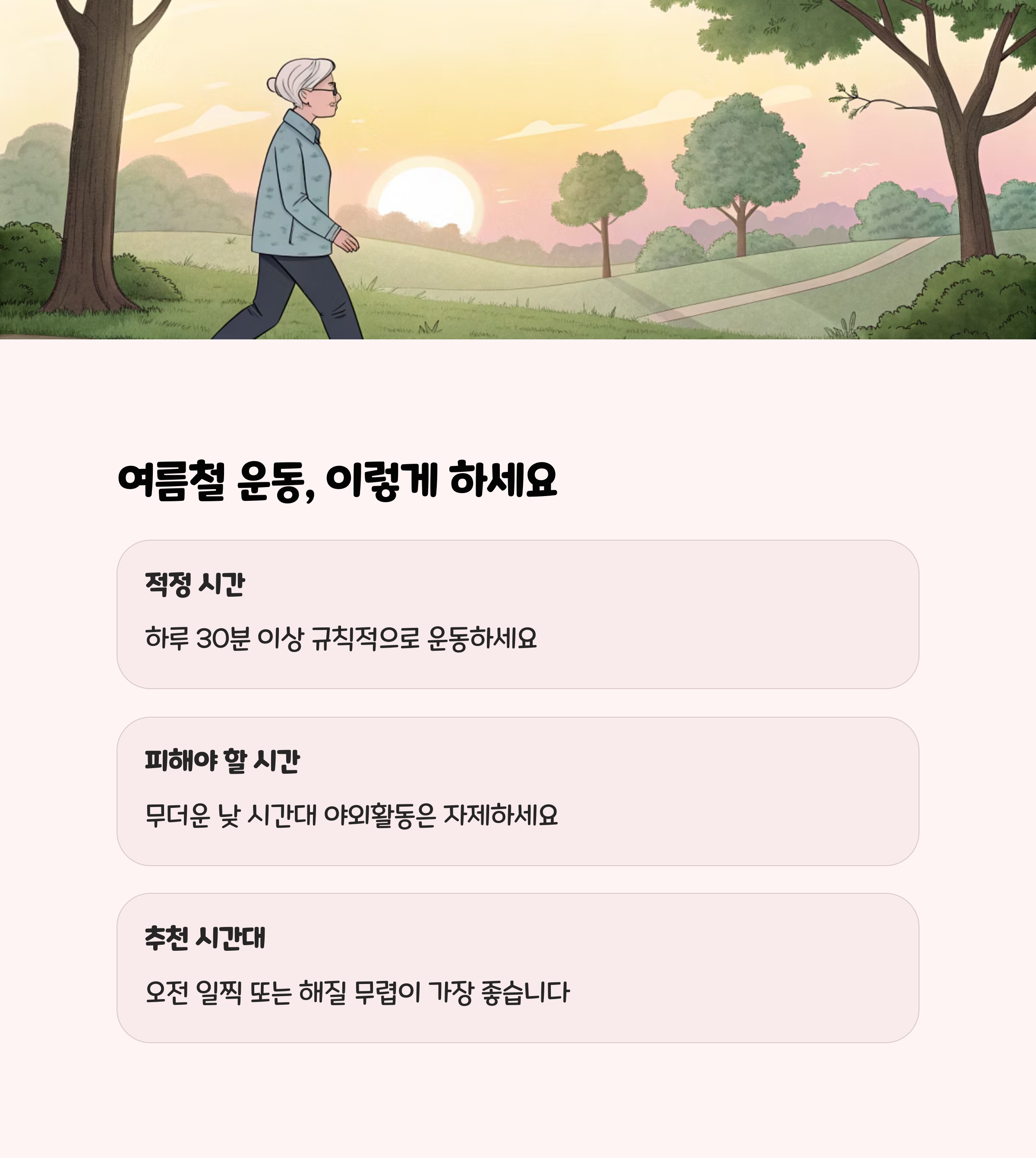 하루 30분 정도 땀이 날 정도의 유산소 운동(걷기, 자전거 타기 등)과 가벼운 근력 운동은 혈압 관리에 매우 효과적입니다. 단, 한낮의 더운 시간대(오전 11시~오후 4시)는 피하고, 실내나 그늘에서 운동하세요. 운동 중 흉통, 어지럼증 등 이상 증상이 나타나면 즉시 중단하고 병원을 방문해야 합니다.