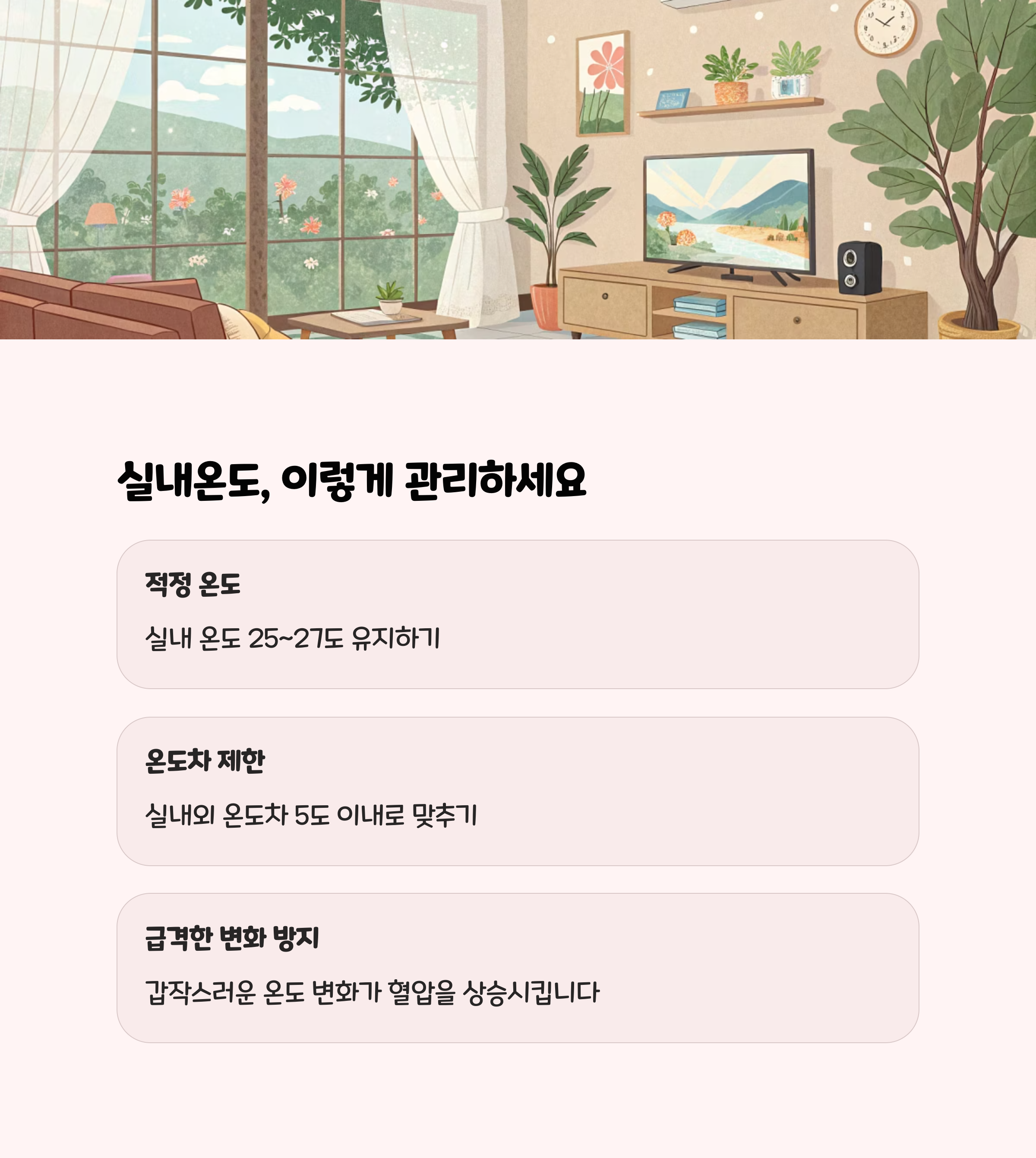 여름철에는 실내외 온도 차이가 5도 이상 벌어지지 않도록 주의해야 합니다. 갑작스러운 온도 변화는 혈관을 수축시켜 혈압을 급상승시킬 수 있습니다. 에어컨을 사용할 때는 실내 온도를 25~27도 정도로 맞추고, 외출 후에는 급격히 찬물로 샤워하지 않는 것이 좋습니다.