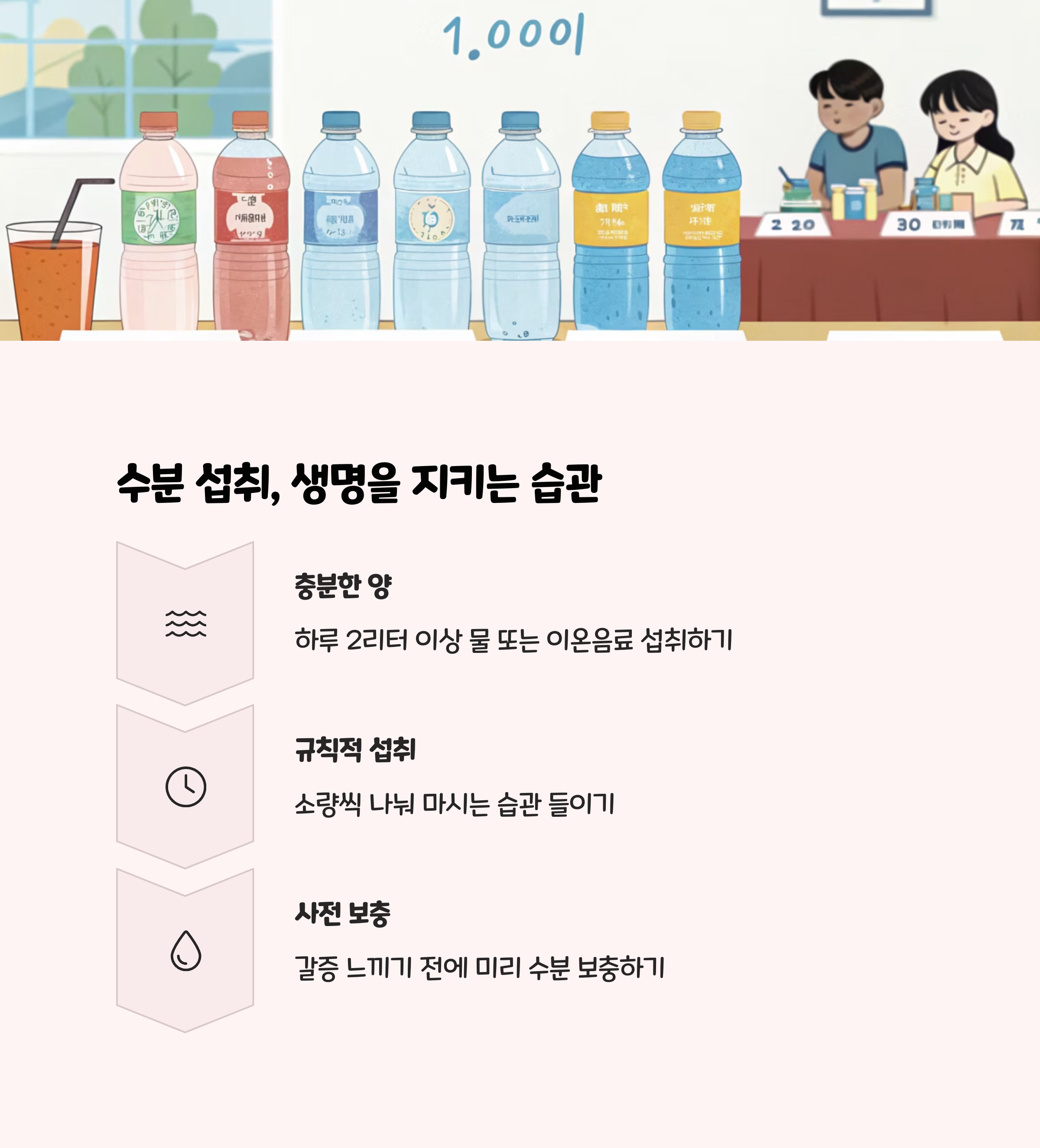 땀을 많이 흘리는 여름에는 하루 2리터 이상의 물을 꾸준히 마시는 것이 중요합니다. 단, 한 번에 많은 양을 마시기보다 여러 번 나눠서 섭취하세요. 또한, 짠 음식과 국물 요리, 가공식품 섭취를 줄이고 싱겁게 먹는 습관이 필요합니다. 염분이 많으면 혈압이 쉽게 오르기 때문입니다.