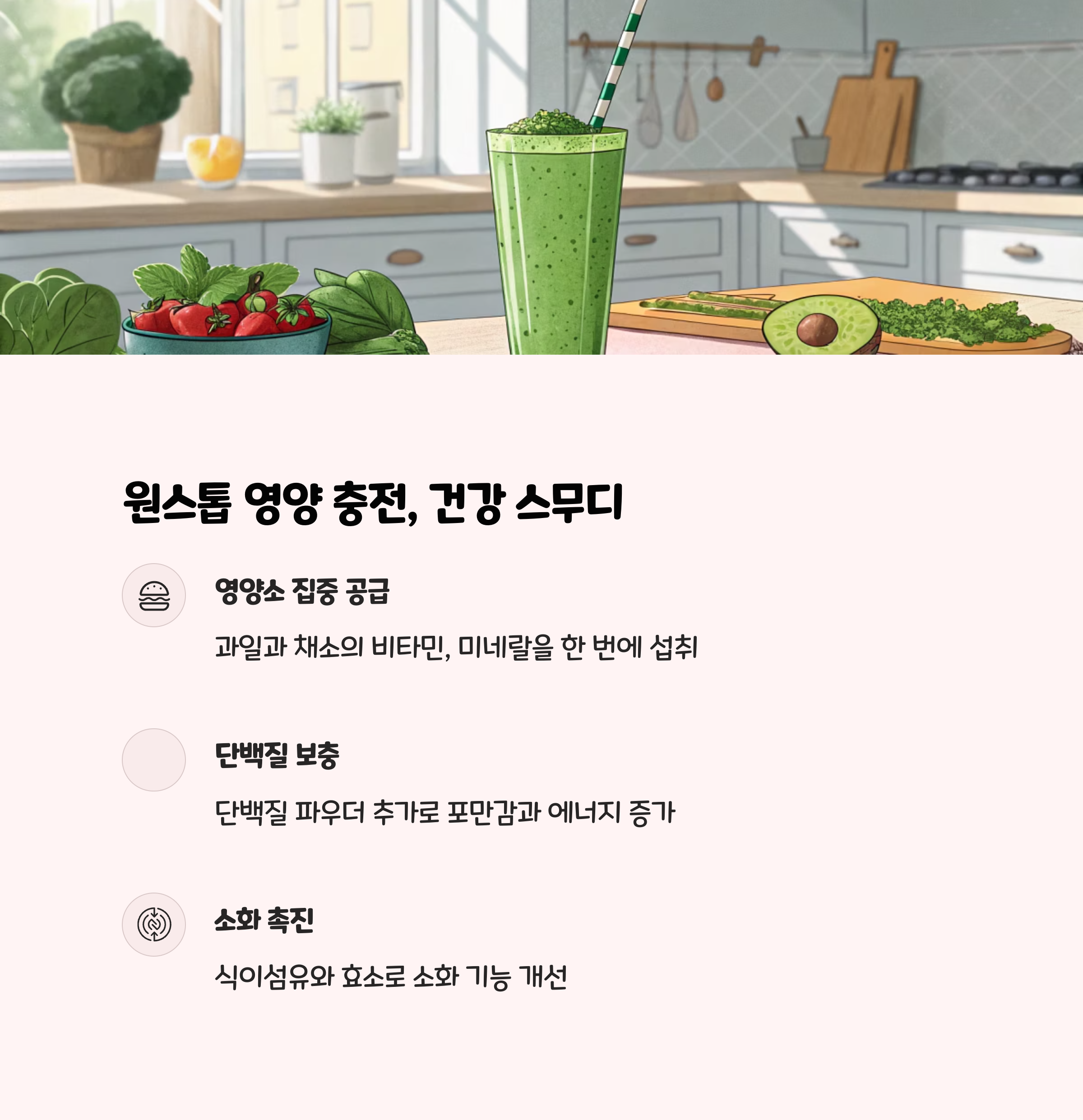 - 영양 데이터 : 스무디 한 잔(약 250ml) 기준 비타민 C 30mg 이상, 식이섬유 4g 내외.