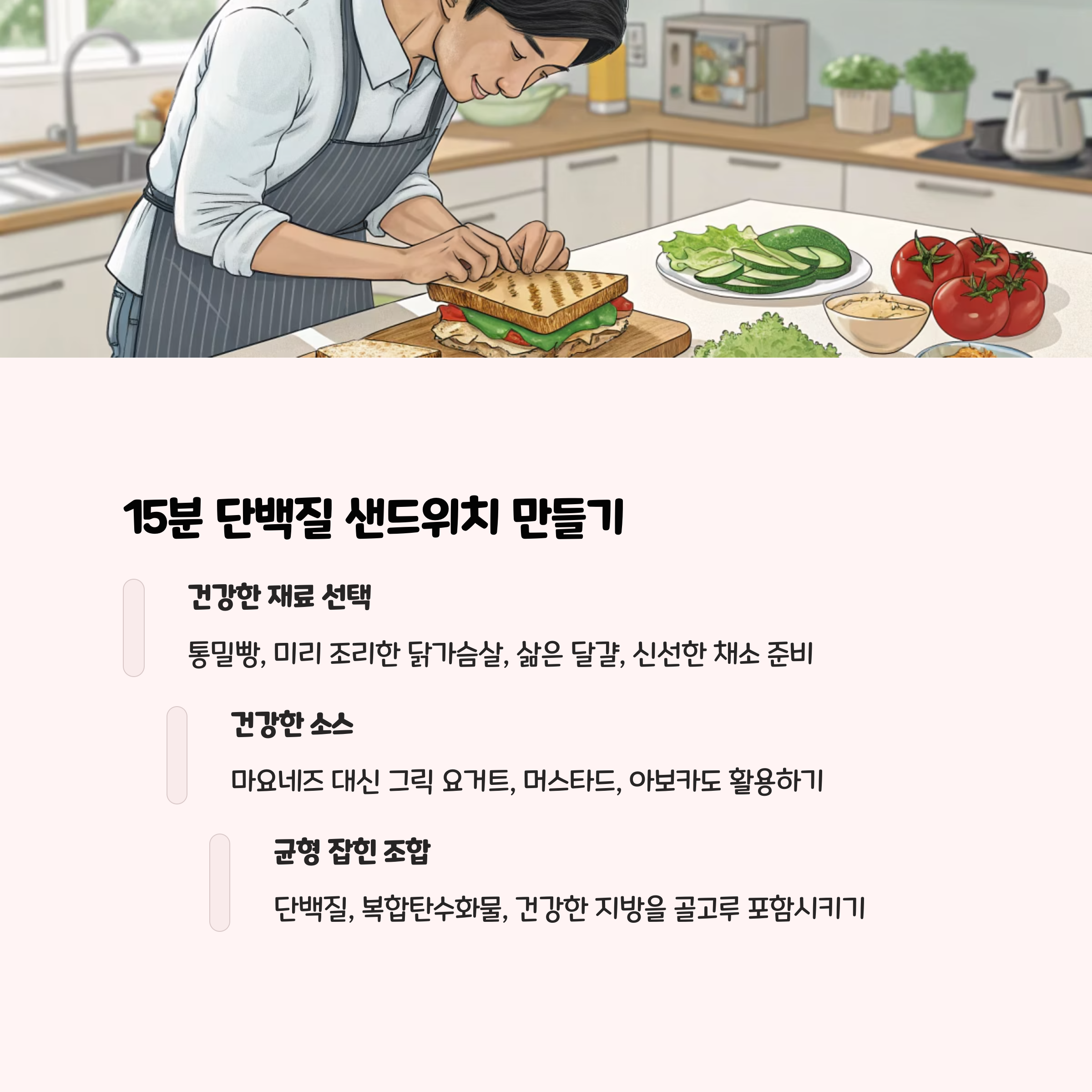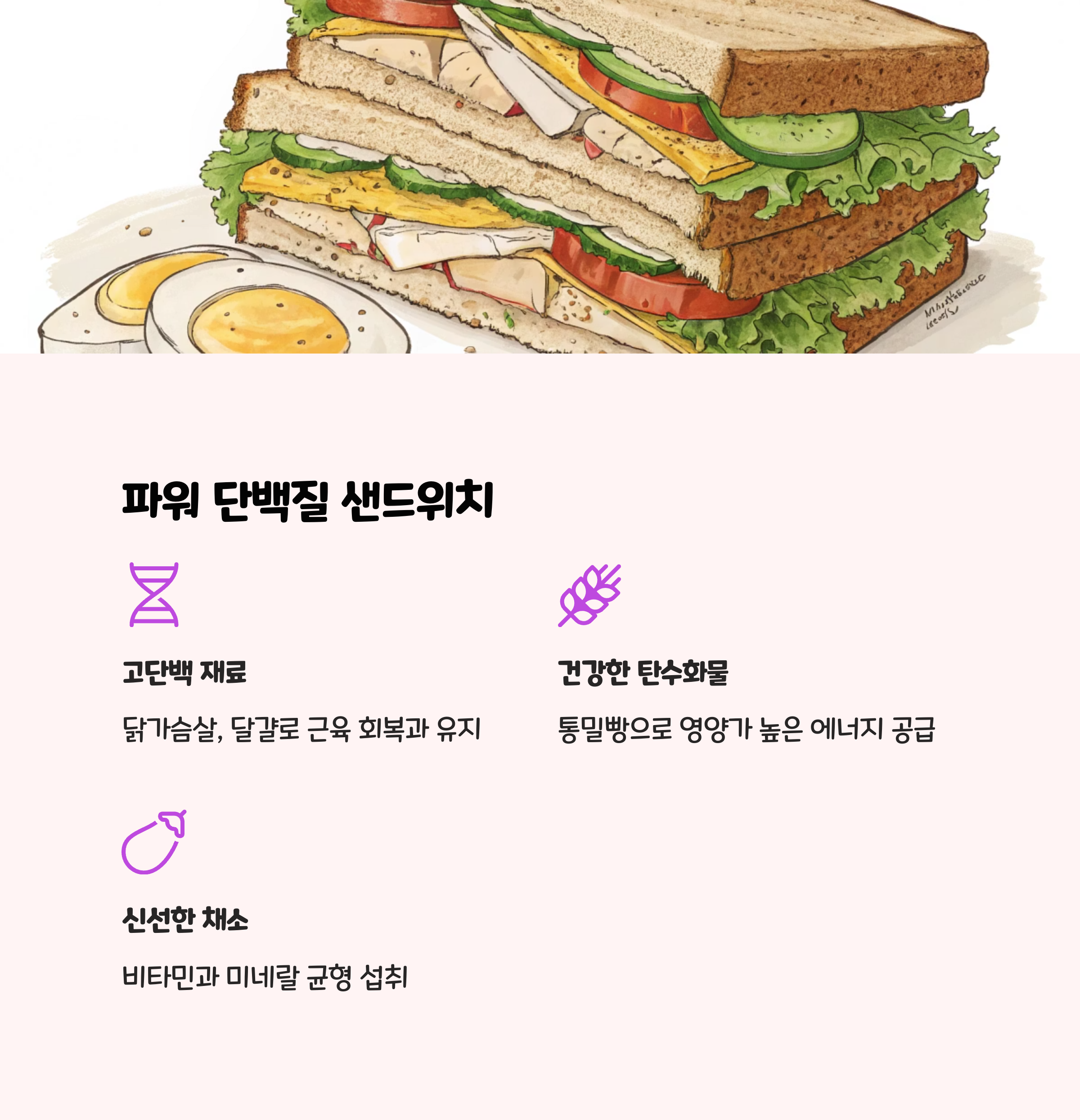 - 영양 데이터 : 닭가슴살 100g 단백질 23g, 통밀빵 1장 식이섬유 2g.