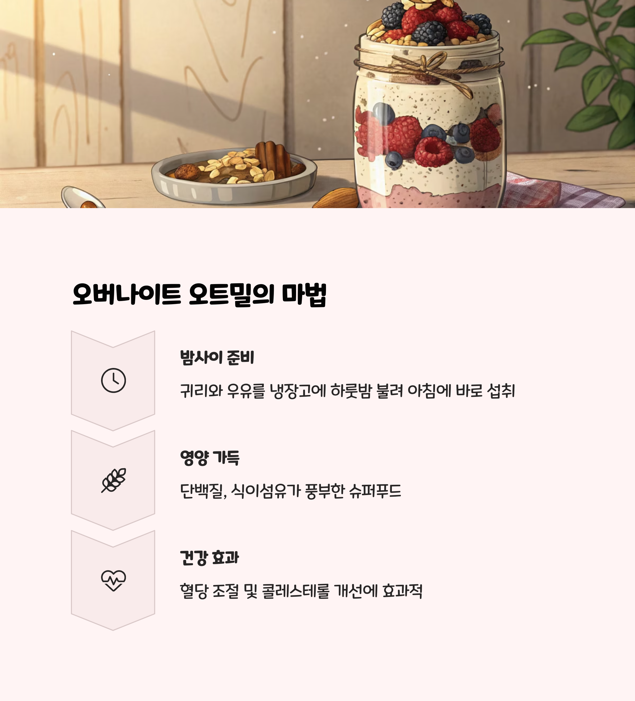 - 장점 : 아침에 바로 꺼내 먹을 수 있어 시간 절약, 식이섬유와 단백질이 풍부해 포만감 지속.