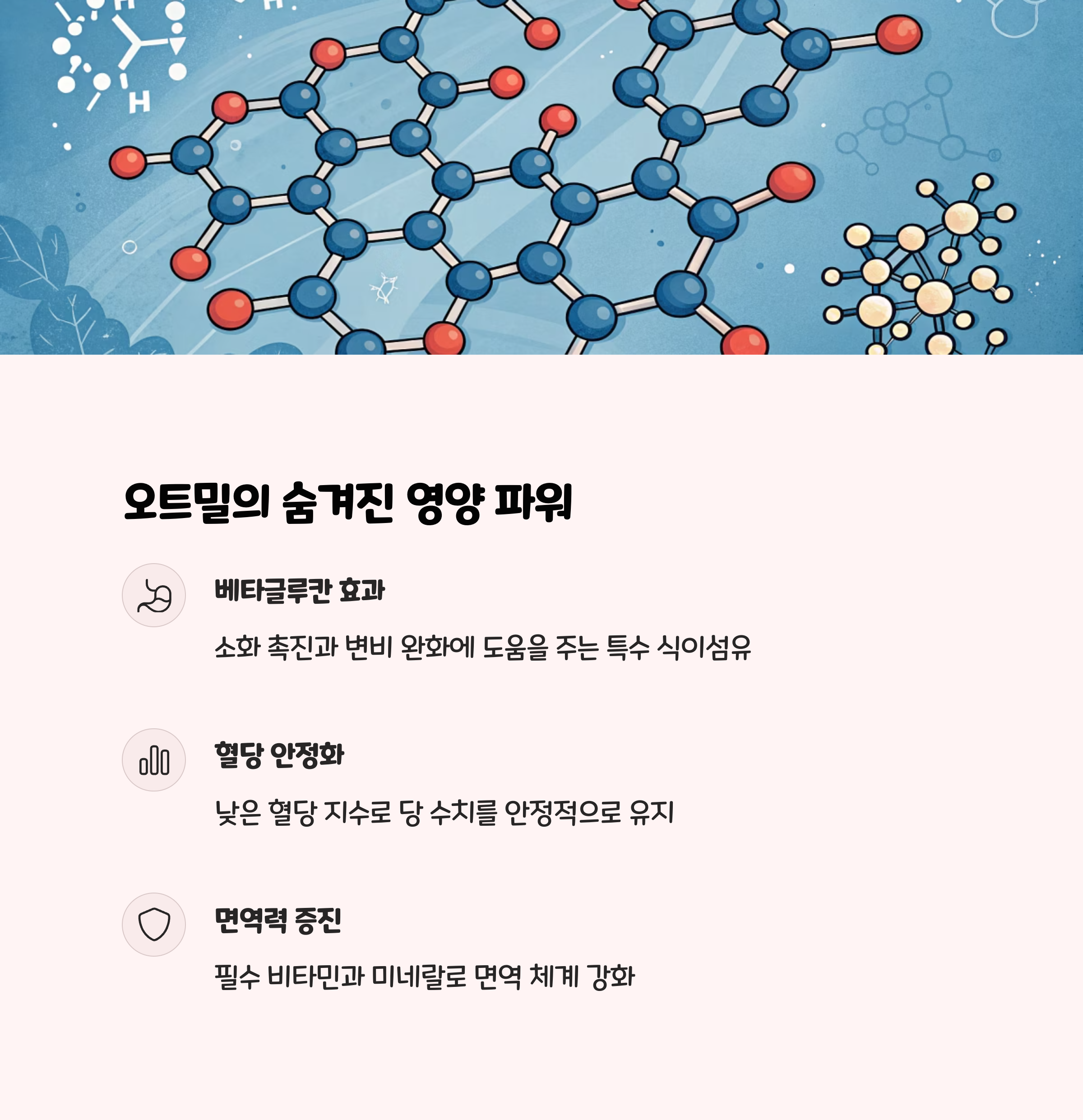- 영양 데이터 : 귀리 3g 섭취 시 콜레스테롤이 5~10% 감소, 심장병 위험도 2%씩 줄어듦.